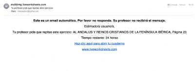 Buenas tardes, desde hace un tiempo, mes, mes y medio, mis alumnos no pueden repetir las fichas que yo les pido que repitan. Ellos reciben el correo en el que les solicito la repetición de alguna ficha, abren el enlace que reciben, pero, este les lleva a liveworksheets pero no a la ficha, como pasaba antes. No sé si viendo la imagen me haré comprender mejor.