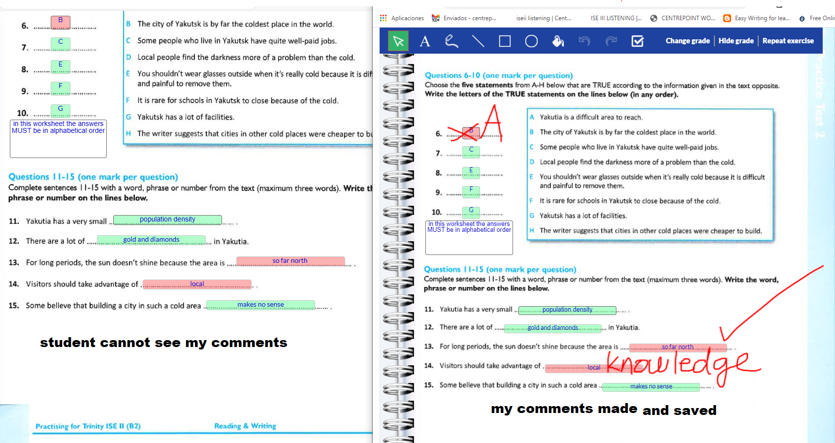 I am horrified to find out 3 weeks on in the new English course that my students CANNOT see my comments on their worksheets!!!