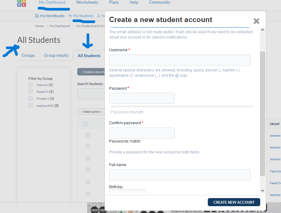 Me he subscrito como profesor. He pagado la subscripción. Creo un nuevo grupo, pero no me permite registrar a los nuevos alumnos. ¿Le ha pasado a alguién más? He escrito a liveworksheets pero no me han dado solución y ya pasa una semana. ¿Qué puedo hacer? Necesito poder empezar a trabajar con mis nuevos alumnos.