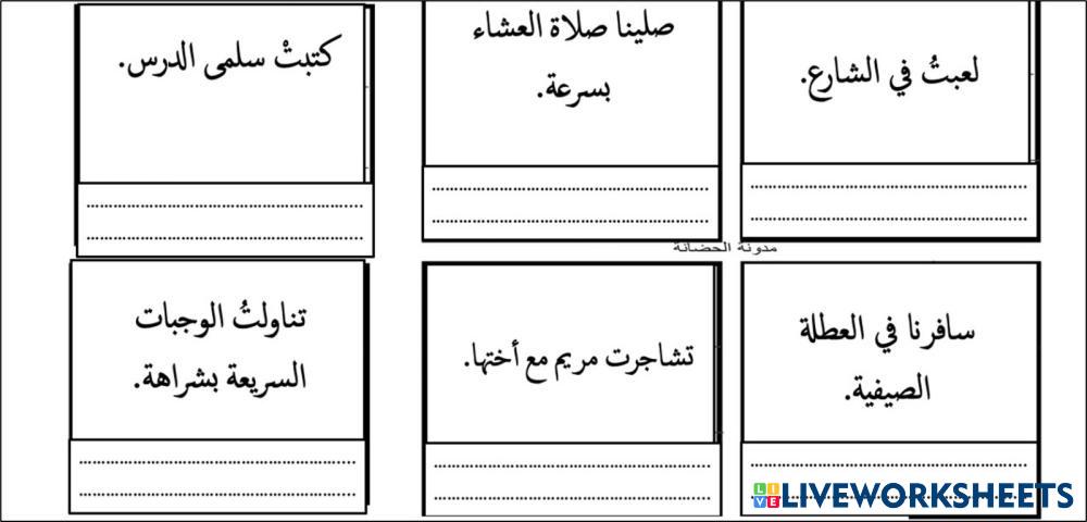 Created by israaali1 ESL Arabic A2 (Básico) Vocabulario Arabic Instrucciones del autor حول الجمل المثبتة لجمل منفية مستخدما أداة النفي لم مع مراعاة التشكيل My Google Classroom Courses × 0 classes selected (0 students total) Quick Access Select all classes (0 classes) All Classes Loading courses... Cancelar Share Share to selected Course __COURSE_NAME__ __STUDENT_NAME__ (__STUDENT_EMAIL__) أداة االنفي لم Descargar Worksheet Validation Comprobar mis respuestas Emails my answers to my teacher Nombre completo Group/level Asignatura Teacher's email or key code Close Submit Validating worksheet... (12) Your answers have been sent to your teacher. Good luck! OK We encountered an error submitting your answers. Please try again. OK Anuncio | Ir sin anuncios Created by israaali1 ESL Arabic A2 (Básico) Vocabulario Arabic Instrucciones del autor حول الجمل المثبتة لجمل منفية مستخدما أداة النفي لم مع مراعاة التشكيل Explora las hojas de trabajo اختبار لغة عربية (الثالث 3) ESL A2 اختبار لغة عربية (الثالث 3) Vocabulary - ESL أرجو منكم اتمام كافة الاسئلة المطلوبة الإحساس بالكرة ESL A2 الإحساس بالكرة Vocabulary - ESL اختر الإجابة الصحيحة أكمل الجملة الناقصة ESL A2 أكمل الجملة الناقصة Vocabulary - ESL صغيري أكمل الجملة الناقصة التي أمامك Arabic basic vocabulary ESL A2 Arabic basic vocabulary Vocabulary - ESL Fill the gaps / Rellena los huecos
