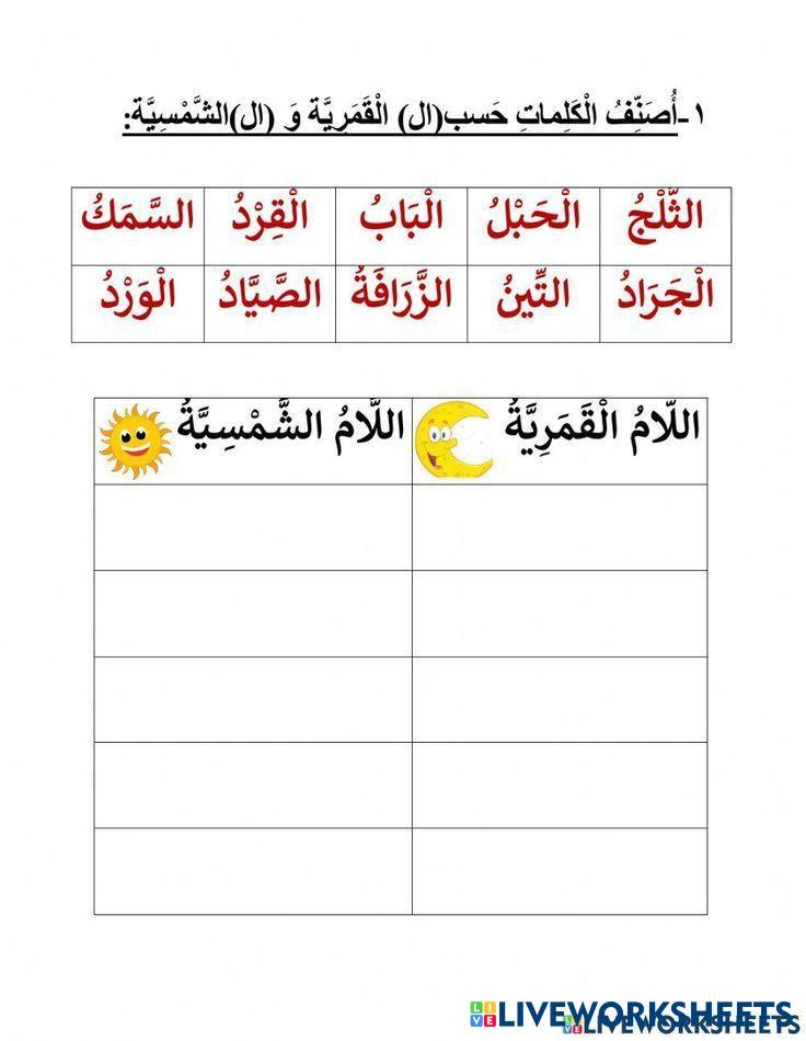 قراءة الكلمات الآتية ثم تصنيف الكلمات الى لام شمسية ولام قمرية