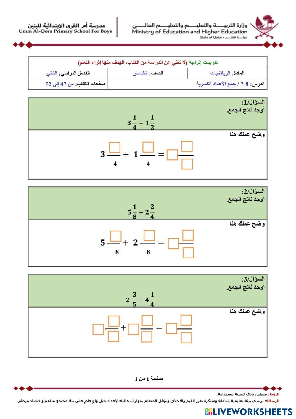 جمع الكسوروالاعداد الكسرية للصف الخامس في قطر