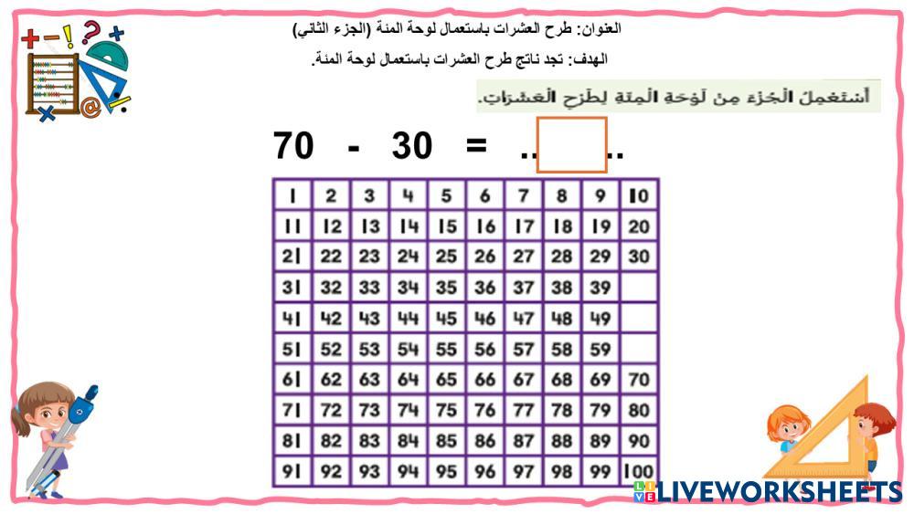 استعمل الجزء من لوحة المئة لطرح العشرات