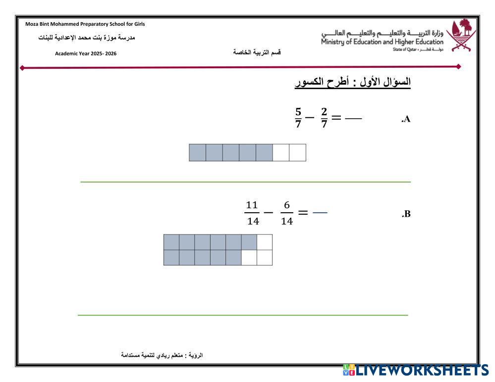 تطرح الكسور ذات المقامات المتشايهة باستخدام النماذج