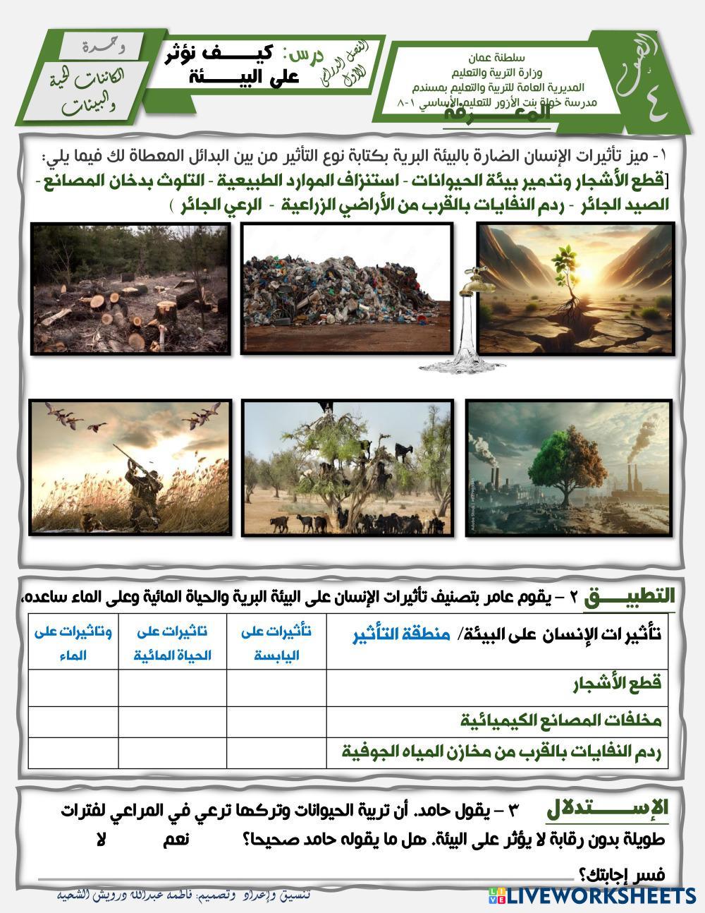 Created byفاطمة عبدالله درويش الشحي science تصنيف الكائنات الحية Edad 8-13 level: 4 Arabic Instrucciones del autor كيف نؤثر على البيئة My Google Classroom Courses × 0 classes selected (0 students total) Quick Access Select all classes (0 classes) All Classes Loading courses... Cancelar Share Share to selected Course __COURSE_NAME__ __STUDENT_NAME__ (__STUDENT_EMAIL__) كيف نؤثر على البيئة ١ Descargar Worksheet Validation Comprobar mis respuestas Emails my answers to my teacher Nombre completo Group/level Asignatura Teacher's email or key code Close Submit Validating worksheet... (12) Your answers have been sent to your teacher. Good luck! OK We encountered an error submitting your answers. Please try again. OK Anuncio | Ir sin anuncios Created byفاطمة عبدالله درويش الشحي science تصنيف الكائنات الحية Edad 8-13 level: 4 Arabic Instrucciones del autor كيف نؤثر على البيئة