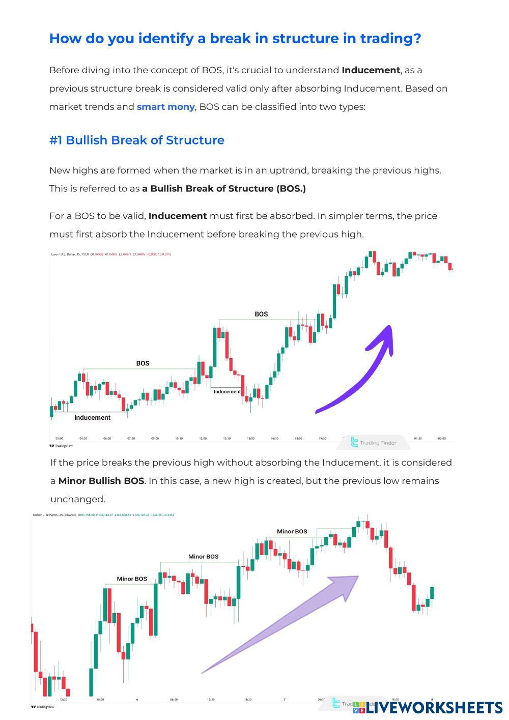 Break of Structure (BOS) refers to continuing the market trend by breaking the previous structure.