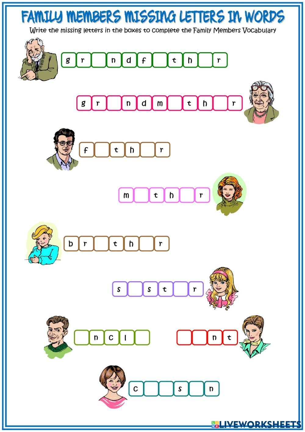 Created by silhergo Englihs as a Second Lnaguage (ESL) FAMILY MEMBERSS Edad 7-11 level: SECOND GRADE English Author's Instructions My Google Classroom Courses × 0 classes selected (0 students total) Quick Access Select all classes (0 classes) All Classes Loading courses... Cancelar Share Share to selected Course __COURSE_NAME__ __STUDENT_NAME__ (__STUDENT_EMAIL__) FAMILY MISSING LETTERS Download Worksheet Validation Comprobar mis respuestas Emails my answers to my teacher Nombre completo Group/level Asignatura Teacher's email or key code Close Submit Validating worksheet... (12) Your answers have been sent to your teacher. Good luck! OK We encountered an error submitting your answers. Please try again. OK Anuncio | Ir sin anuncios Created by silhergo Englihs as a Second Lnaguage (ESL) FAMILY MEMBERSS Edad 7-11 level: SECOND GRADE English Author's Instructions