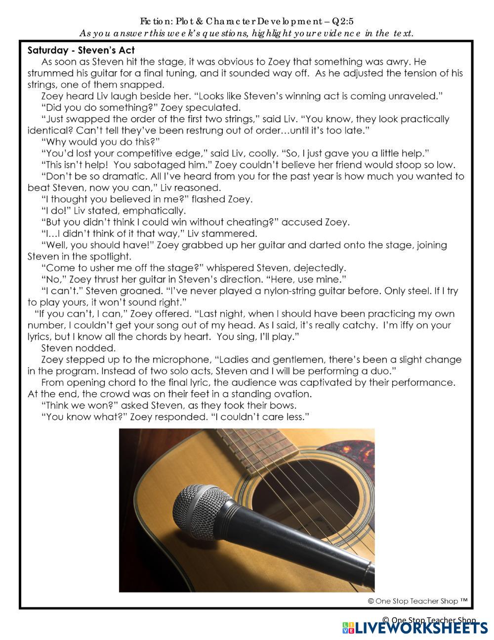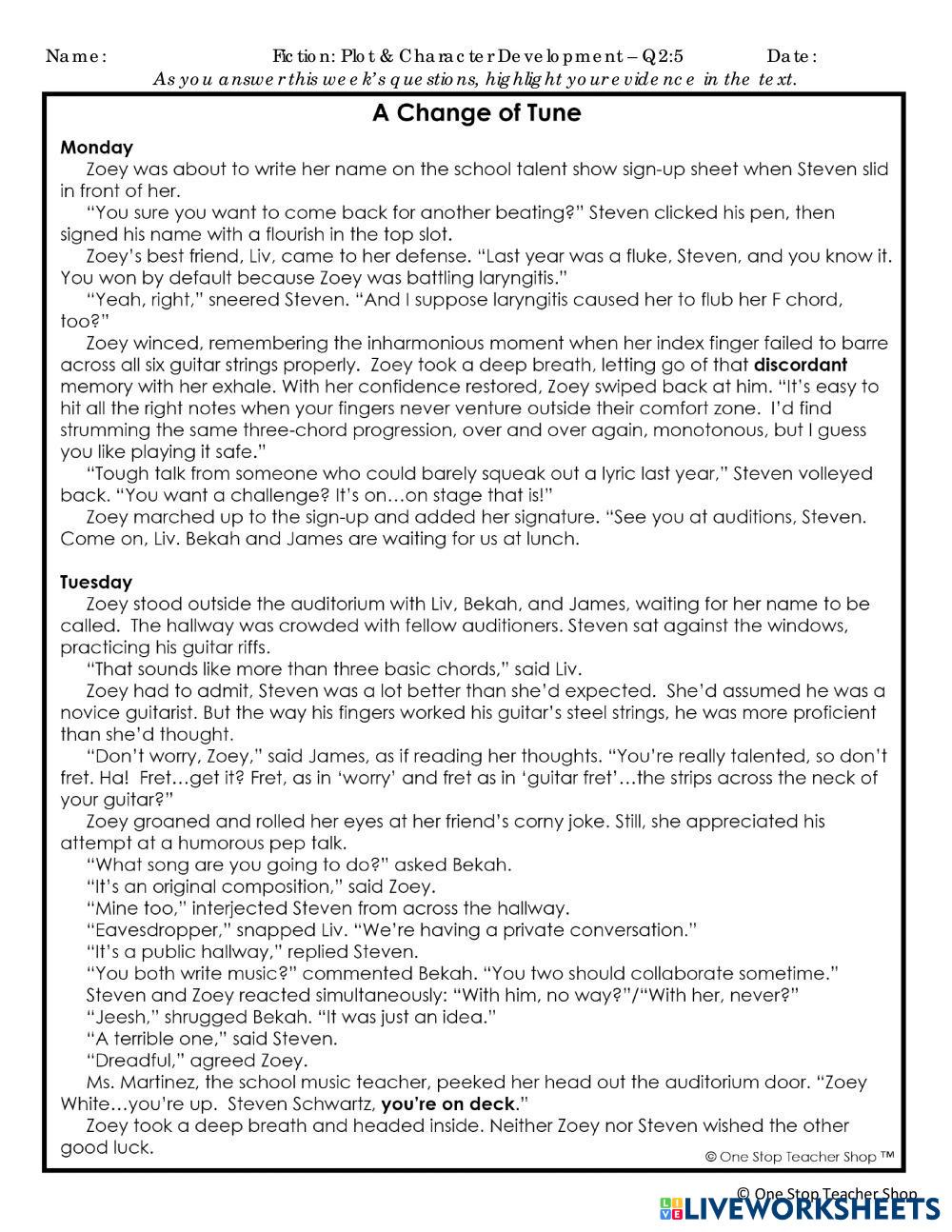 Created byShate Toliver English Language Arts (ELA) Plot structure Edad 10-16 level: 6th English Instrucciones del autor My Google Classroom Courses × 0 classes selected (0 students total) Quick Access Select all classes (0 classes) All Classes Loading courses... Cancelar Share Share to selected Course __COURSE_NAME__ __STUDENT_NAME__ (__STUDENT_EMAIL__) Change of Tune Descargar Worksheet Validation Comprobar mis respuestas Emails my answers to my teacher Nombre completo Group/level Asignatura Teacher's email or key code Close Submit Validating worksheet... (12) Your answers have been sent to your teacher. Good luck! OK We encountered an error submitting your answers. Please try again. OK Anuncio | Ir sin anuncios Created byShate Toliver English Language Arts (ELA) Plot structure Edad 10-16 level: 6th English Instrucciones del autor