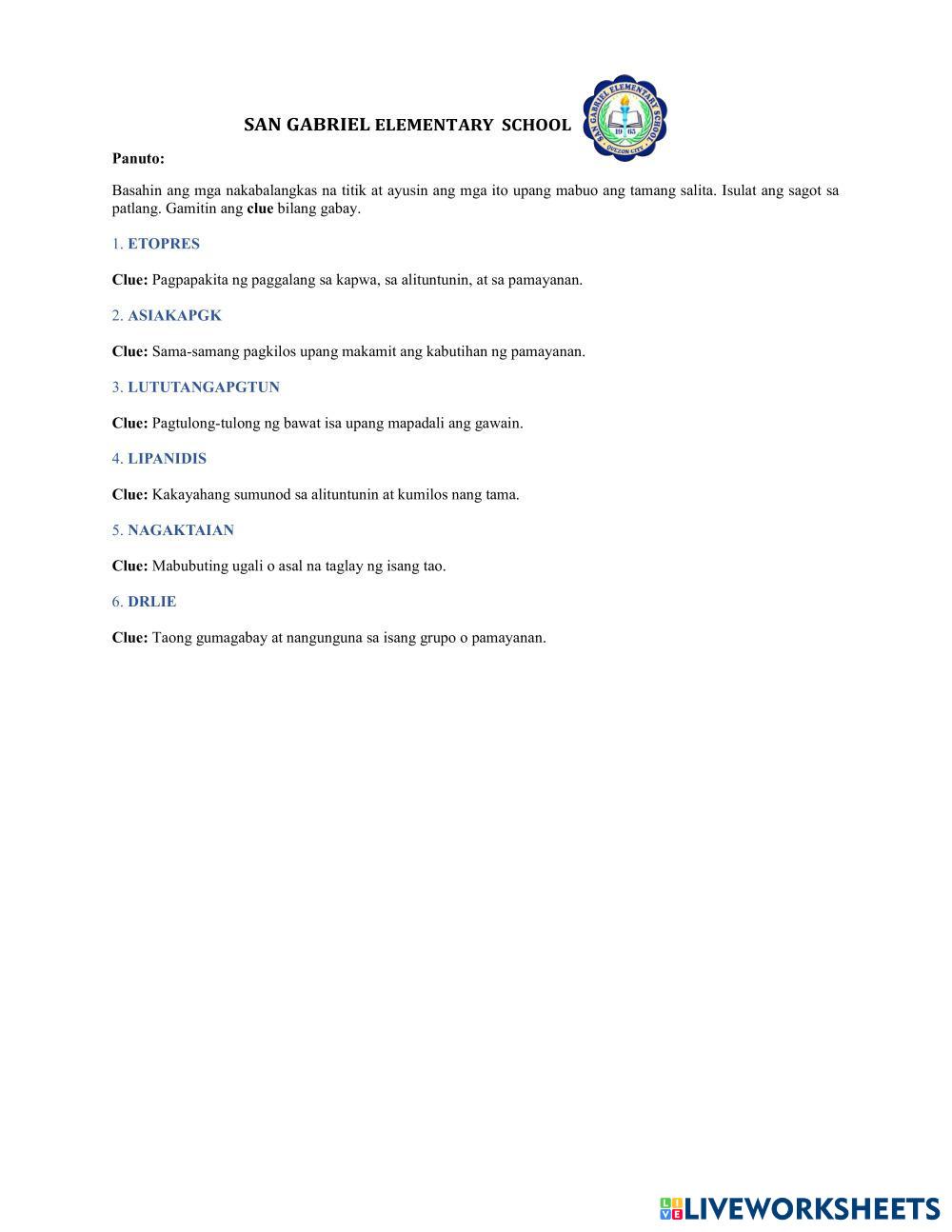 Basahin ang mga nakabalangkas na titik at ayusin ang mga ito upang mabuo ang tamang salita. Isulat ang sagot sa patlang. Gamitin ang clue bilang gabay.