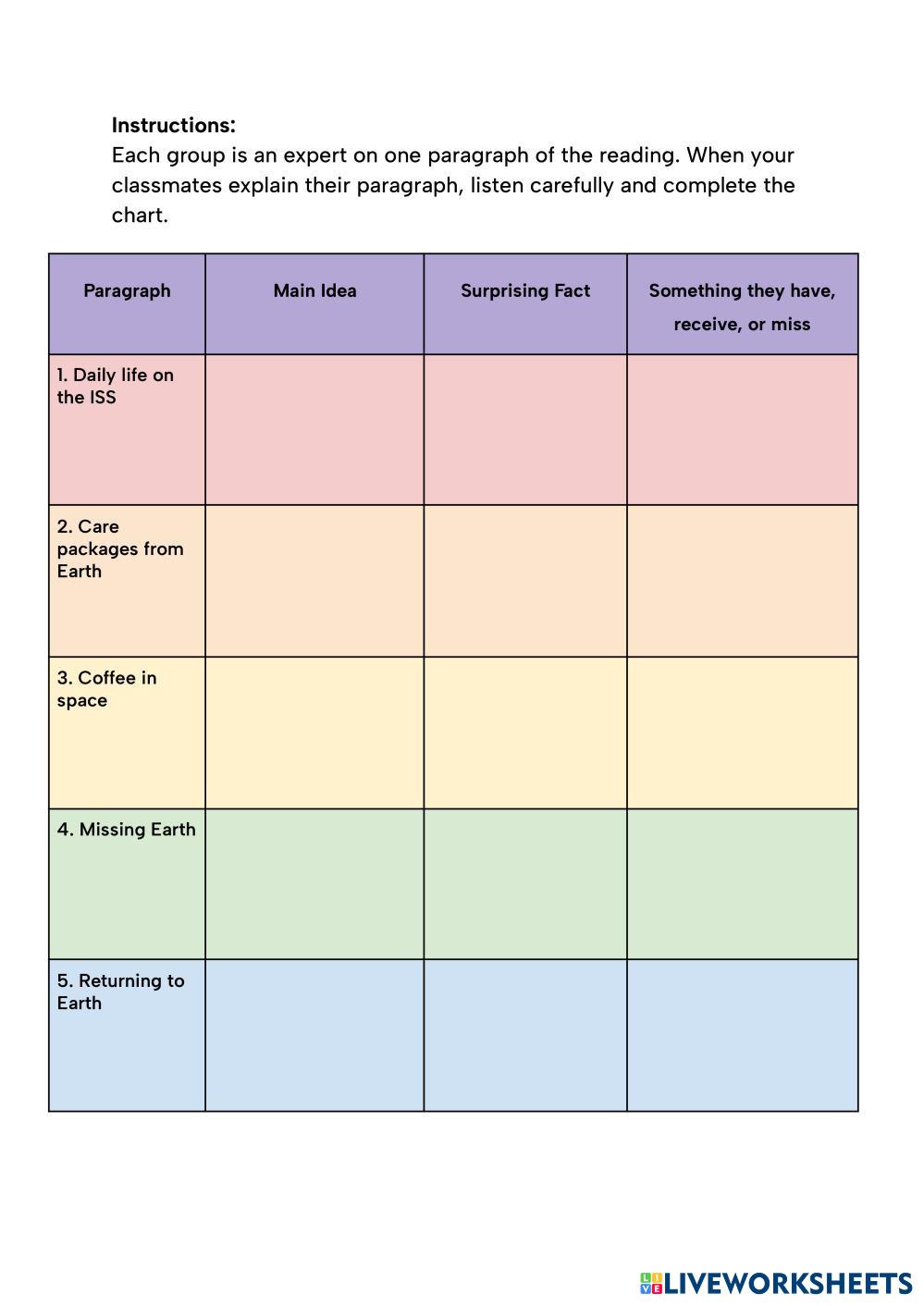 Each group is an expert on one paragraph of the reading. When your classmates explain their paragraph, listen carefully and complete the chart.