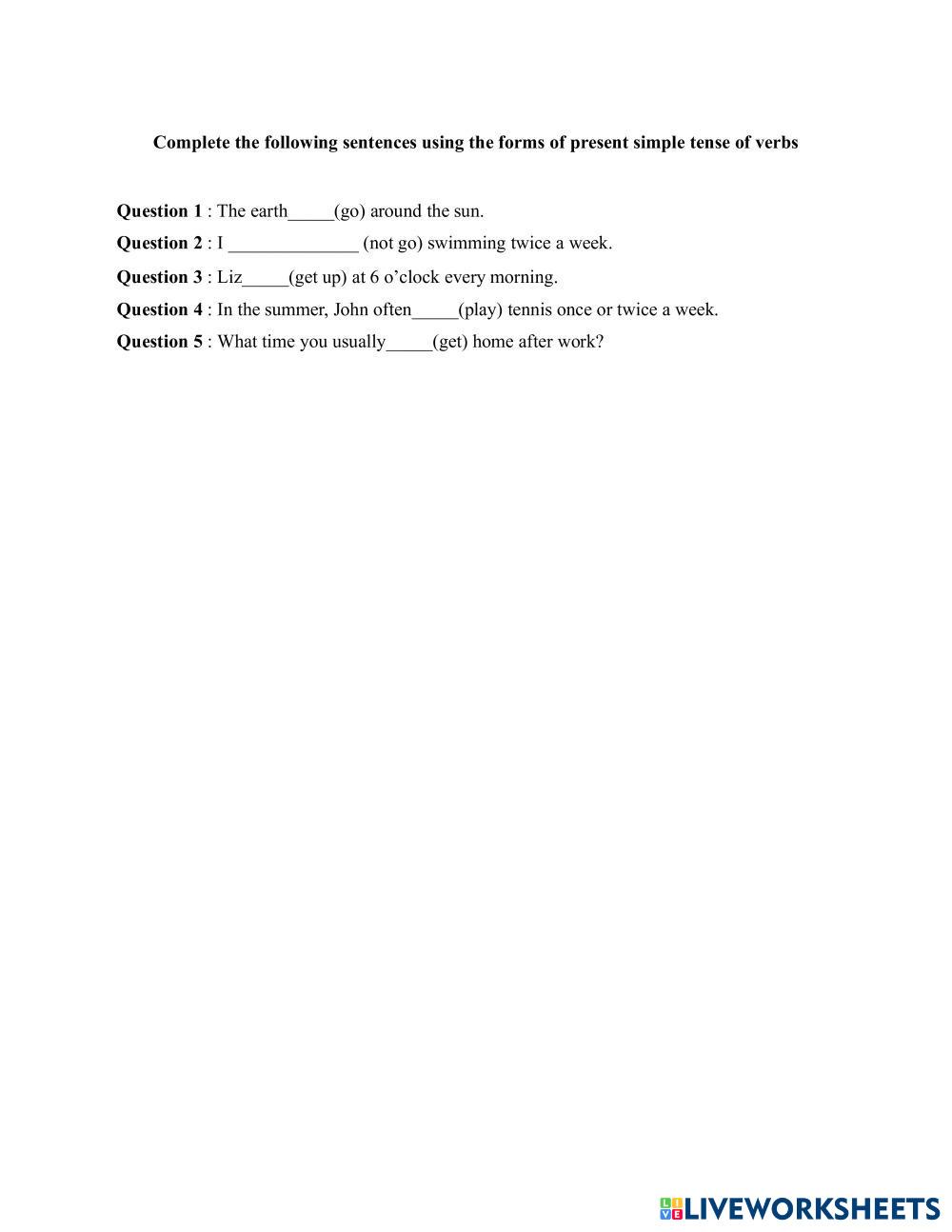 Created by trangthu7 Lengua y Literatura Bachillerato 4º de ESO Vocabulario English Instrucciones del autor Complete the following sentences using the forms of present simple tense of verbs. My Google Classroom Courses × 0 classes selected (0 students total) Quick Access Select all classes (0 classes) All Classes Loading courses... Cancelar Share Share to selected Course __COURSE_NAME__ __STUDENT_NAME__ (__STUDENT_EMAIL__) UNIT 1: GRAMMAR Descargar Worksheet Validation Comprobar mis respuestas Emails my answers to my teacher Nombre completo Group/level Asignatura Teacher's email or key code Close Submit Validating worksheet... (12) Your answers have been sent to your teacher. Good luck! OK We encountered an error submitting your answers. Please try again. OK Anuncio | Ir sin anuncios Created by trangthu7 Lengua y Literatura Bachillerato 4º de ESO Vocabulario English Instrucciones del autor Complete the following sentences using the forms of present simple tense of verbs. Explora las hojas de trabajo Matching vocabulary English Language 10th grade Matching vocabulary Vocabulary - English Language Matching vocabulary based on context Practice Exercises - Conjugate the verbs in the Present Simple tense. English Language 10th grade Practice Exercises - Conjugate the verbs in the Present Simple tense. Vocabulary - English Language Do exercise exercise 2 English Language 10th grade exercise 2 Vocabulary - English Language fill in the blank UNIT 1: GRAMMAR_PRESENT SIMPLE TENSE English Language 10th grade UNIT 1: GRAMMAR_PRESENT SIMPLE TENSE Vocabulary - English Language Complete the following sentences using the forms of present simple tense of verbs.