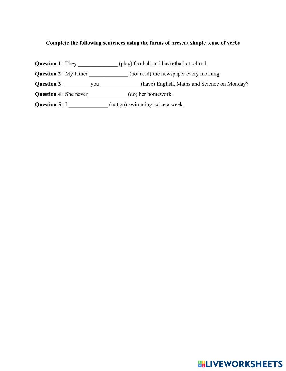 Created by trangthu7 Lengua y Literatura Bachillerato 4º de ESO Vocabulario English Instrucciones del autor Complete the following sentences using the forms of present simple tense of verbs. My Google Classroom Courses × 0 classes selected (0 students total) Quick Access Select all classes (0 classes) All Classes Loading courses... Cancelar Share Share to selected Course __COURSE_NAME__ __STUDENT_NAME__ (__STUDENT_EMAIL__) UNIT 1: GRAMMAR_PRESENT SIMPLE TENSE Descargar Worksheet Validation Comprobar mis respuestas Emails my answers to my teacher Nombre completo Group/level Asignatura Teacher's email or key code Close Submit Validating worksheet... (12) Your answers have been sent to your teacher. Good luck! OK We encountered an error submitting your answers. Please try again. OK Anuncio | Ir sin anuncios Created by trangthu7 Lengua y Literatura Bachillerato 4º de ESO Vocabulario English Instrucciones del autor Complete the following sentences using the forms of present simple tense of verbs. Explora las hojas de trabajo Matching vocabulary English Language 10th grade Matching vocabulary Vocabulary - English Language Matching vocabulary based on context Practice Exercises - Conjugate the verbs in the Present Simple tense. English Language 10th grade Practice Exercises - Conjugate the verbs in the Present Simple tense. Vocabulary - English Language Do exercise exercise 2 English Language 10th grade exercise 2 Vocabulary - English Language fill in the blank UNIT 1: GRAMMAR English Language 10th grade UNIT 1: GRAMMAR Vocabulary - English Language Complete the following sentences using the forms of present simple tense of verbs.