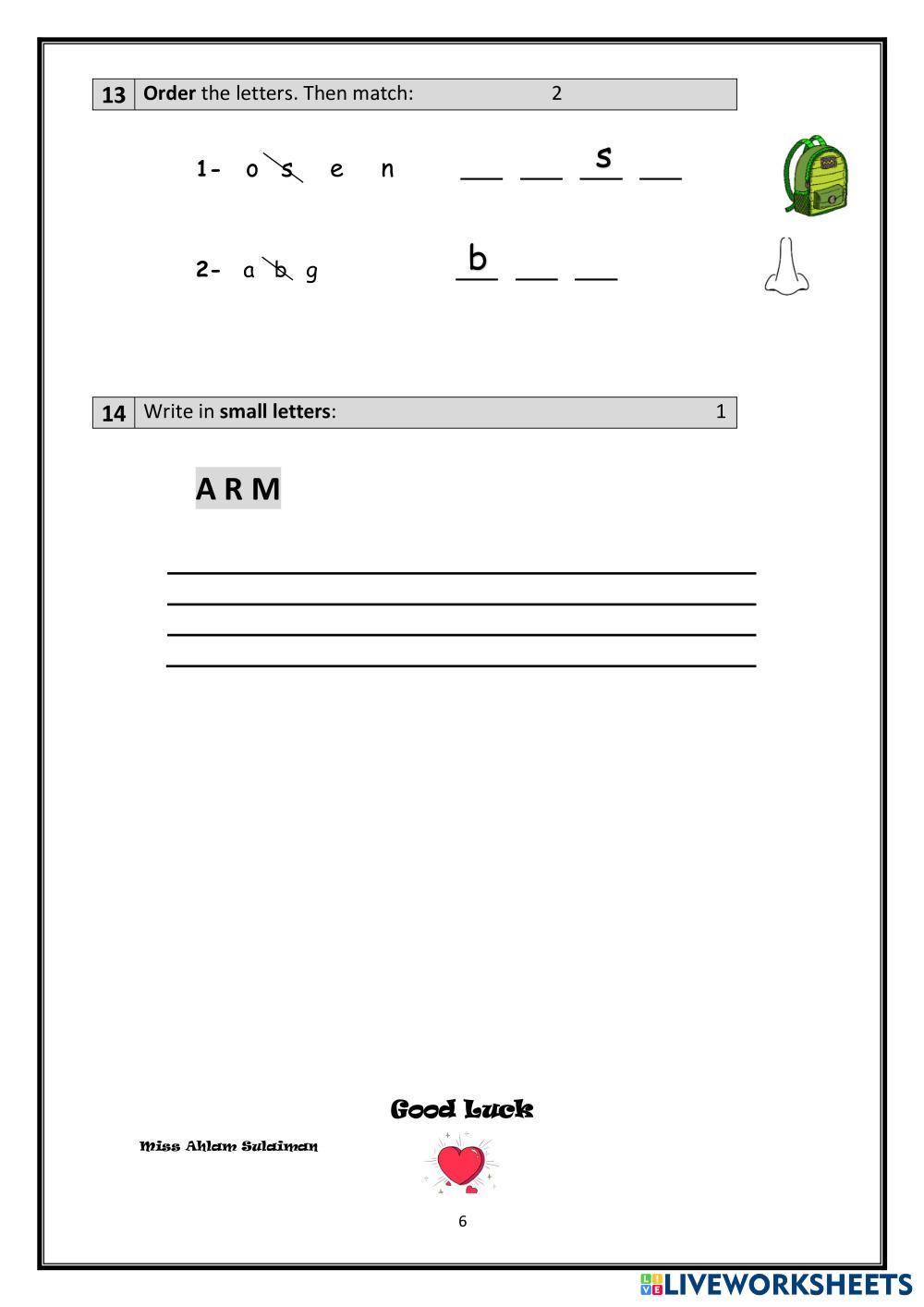 ورقة عمل للصف الاول