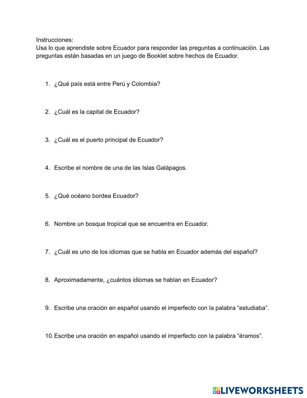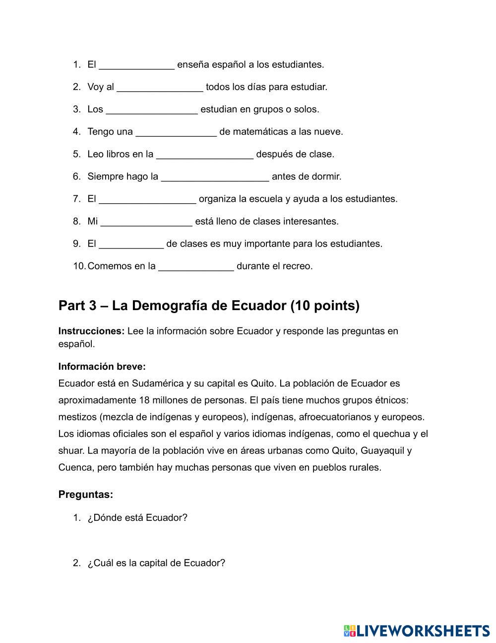 Bienvenidos al examen de Español 2: Cultura, Geografía y Gramática de Ecuador. Lee cuidadosamente cada sección y sigue las instrucciones. Escribe tus respuestas en español cuando sea posible.