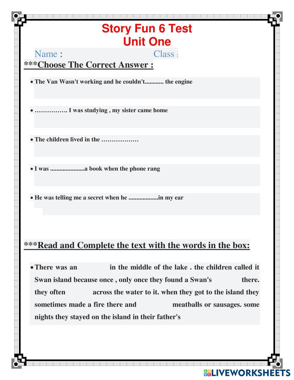 Created byDoaa Ahmed AbdElsabour English language Tests and exams Edad 10-15 level: 6th English Instrucciones del autor My Google Classroom Courses × 0 classes selected (0 students total) Quick Access Select all classes (0 classes) All Classes Loading courses... Cancelar Share Share to selected Course __COURSE_NAME__ __STUDENT_NAME__ (__STUDENT_EMAIL__) story fun 6 test Descargar Worksheet Validation Comprobar mis respuestas Emails my answers to my teacher Nombre completo Group/level Asignatura Teacher's email or key code Close Submit Validating worksheet... (12) Your answers have been sent to your teacher. Good luck! OK We encountered an error submitting your answers. Please try again. OK Anuncio | Ir sin anuncios Created byDoaa Ahmed AbdElsabour English language Tests and exams Edad 10-15 level: 6th English Instrucciones del autor
