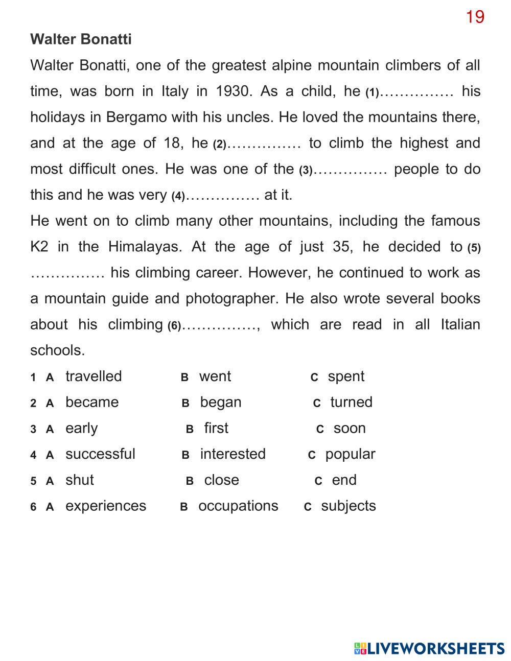 Created byTA Day Kem - A2 English language 19 Edad 12-15 level: 6-8 English Instrucciones del autor My Google Classroom Courses × 0 classes selected (0 students total) Quick Access Select all classes (0 classes) All Classes Loading courses... Cancelar Share Share to selected Course __COURSE_NAME__ __STUDENT_NAME__ (__STUDENT_EMAIL__) 19 Descargar Worksheet Validation Comprobar mis respuestas Emails my answers to my teacher Nombre completo Group/level Asignatura Teacher's email or key code Close Submit Validating worksheet... (12) Your answers have been sent to your teacher. Good luck! OK We encountered an error submitting your answers. Please try again. OK Anuncio | Ir sin anuncios Created byTA Day Kem - A2 English language 19 Edad 12-15 level: 6-8 English Instrucciones del autor