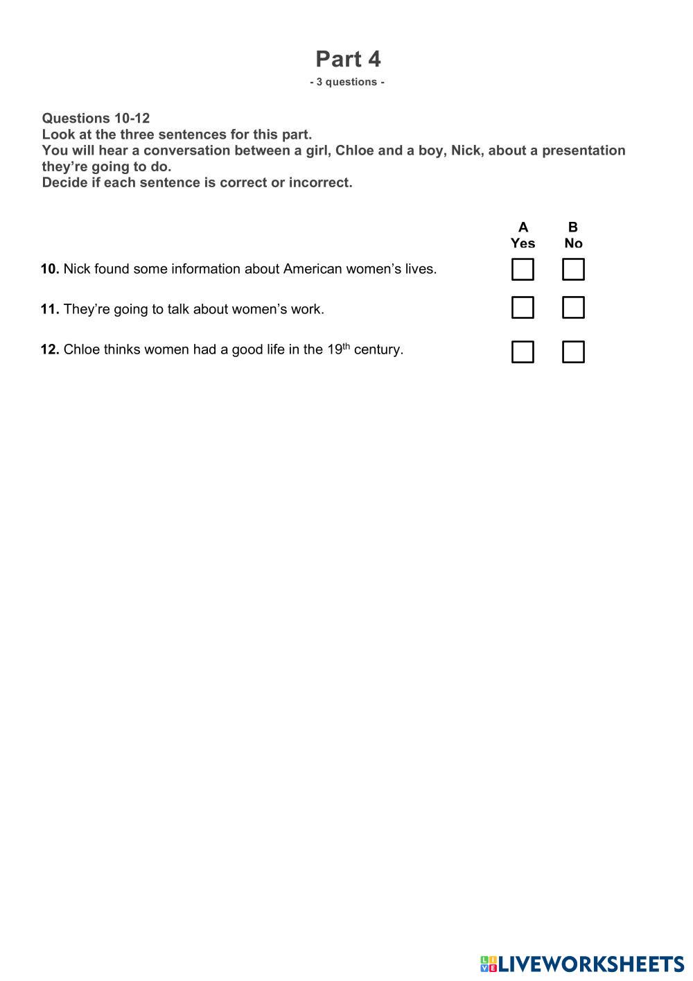 Created byTA Day Kem - Movers English language English Edad 12-18 level: 8 English Instrucciones del autor My Google Classroom Courses × 0 classes selected (0 students total) Quick Access Select all classes (0 classes) All Classes Loading courses... Cancelar Share Share to selected Course __COURSE_NAME__ __STUDENT_NAME__ (__STUDENT_EMAIL__) _SW8 Theme 2 Listening Descargar Worksheet Validation Comprobar mis respuestas Emails my answers to my teacher Nombre completo Group/level Asignatura Teacher's email or key code Close Submit Validating worksheet... (12) Your answers have been sent to your teacher. Good luck! OK We encountered an error submitting your answers. Please try again. OK Anuncio | Ir sin anuncios Created byTA Day Kem - Movers English language English Edad 12-18 level: 8 English Instrucciones del autor