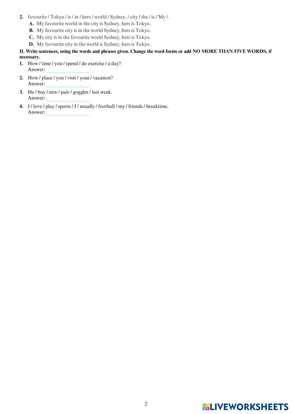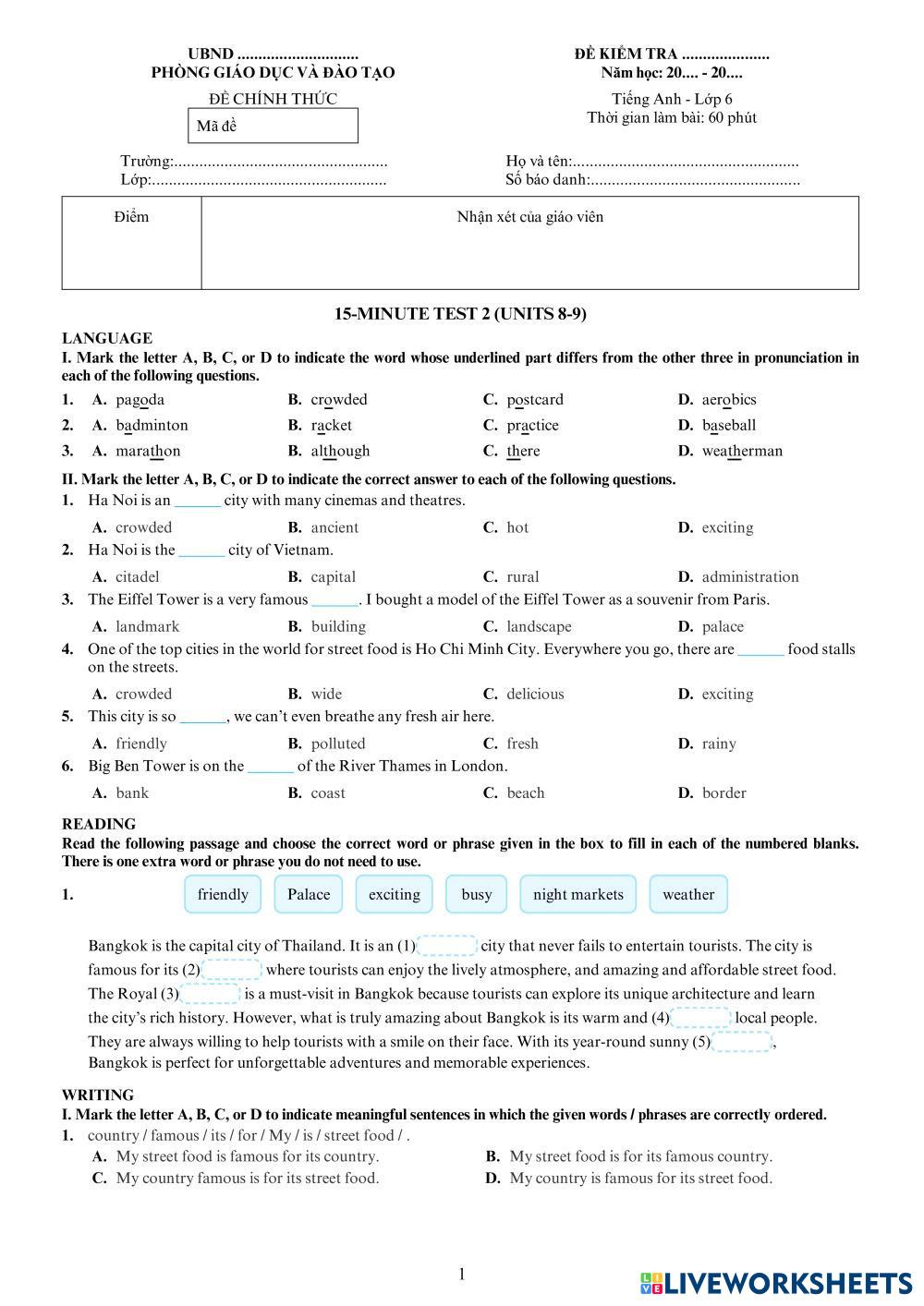 Created byTA Day Kem - Flyers English language English Edad 12-18 level: 6-8 English Instrucciones del autor My Google Classroom Courses × 0 classes selected (0 students total) Quick Access Select all classes (0 classes) All Classes Loading courses... Cancelar Share Share to selected Course __COURSE_NAME__ __STUDENT_NAME__ (__STUDENT_EMAIL__) 15-MINUTE TEST 6 (UNITS 8-9) Descargar Worksheet Validation Comprobar mis respuestas Emails my answers to my teacher Nombre completo Group/level Asignatura Teacher's email or key code Close Submit Validating worksheet... (12) Your answers have been sent to your teacher. Good luck! OK We encountered an error submitting your answers. Please try again. OK Anuncio | Ir sin anuncios Created byTA Day Kem - Flyers English language English Edad 12-18 level: 6-8 English Instrucciones del autor
