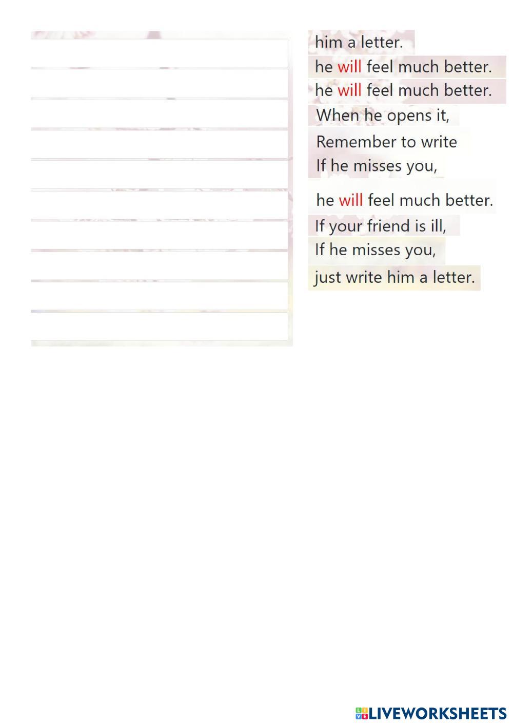 Created by malenik1108 English as a Second Language (ESL) Vovabulary Edad 8-13 level: A1 English Instrucciones del autor My Google Classroom Courses × 0 classes selected (0 students total) Quick Access Select all classes (0 classes) All Classes Loading courses... Cancelar Share Share to selected Course __COURSE_NAME__ __STUDENT_NAME__ (__STUDENT_EMAIL__) Song If your friend is ill Descargar Worksheet Validation Comprobar mis respuestas Emails my answers to my teacher Nombre completo Group/level Asignatura Teacher's email or key code Close Submit Validating worksheet... (12) Your answers have been sent to your teacher. Good luck! OK We encountered an error submitting your answers. Please try again. OK Anuncio | Ir sin anuncios Created by malenik1108 English as a Second Language (ESL) Vovabulary Edad 8-13 level: A1 English Instrucciones del autor