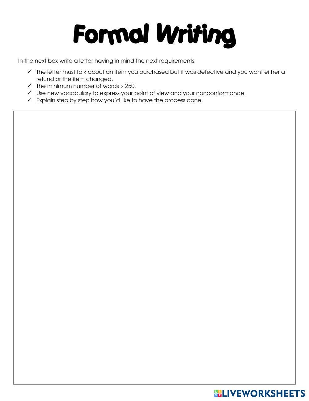 Created byJeison Andres Burgos Acosta English as a Second Language (ESL) Writing Edad 16+ level: C1 English Instrucciones del autor Formal writing about particular situations. My Google Classroom Courses × 0 classes selected (0 students total) Quick Access Select all classes (0 classes) All Classes Loading courses... Cancelar Share Share to selected Course __COURSE_NAME__ __STUDENT_NAME__ (__STUDENT_EMAIL__) Formal Writing Descargar Worksheet Validation Comprobar mis respuestas Emails my answers to my teacher Nombre completo Group/level Asignatura Teacher's email or key code Close Submit Validating worksheet... (12) Your answers have been sent to your teacher. Good luck! OK We encountered an error submitting your answers. Please try again. OK Anuncio | Ir sin anuncios Created byJeison Andres Burgos Acosta English as a Second Language (ESL) Writing Edad 16+ level: C1 English Instrucciones del autor Formal writing about particular situations.