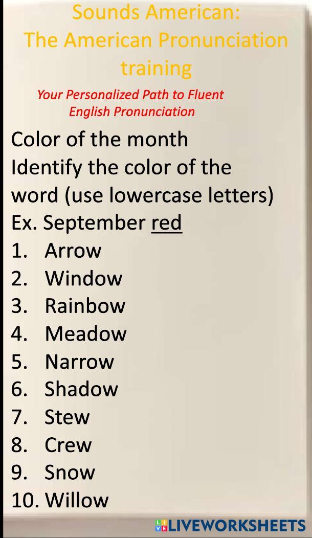Created byTrainer G English Identify the Colors Edad 5+ level: Intermediate English Author's Instructions My Google Classroom Courses × 0 classes selected (0 students total) Quick Access Select all classes (0 classes) All Classes Loading courses... Cancelar Share Share to selected Course __COURSE_NAME__ __STUDENT_NAME__ (__STUDENT_EMAIL__) Word Color w Download Worksheet Validation Comprobar mis respuestas Emails my answers to my teacher Nombre completo Group/level Asignatura Teacher's email or key code Close Submit Validating worksheet... (12) Your answers have been sent to your teacher. Good luck! OK We encountered an error submitting your answers. Please try again. OK Anuncio | Ir sin anuncios Created byTrainer G English Identify the Colors Edad 5+ level: Intermediate English Author's Instructions