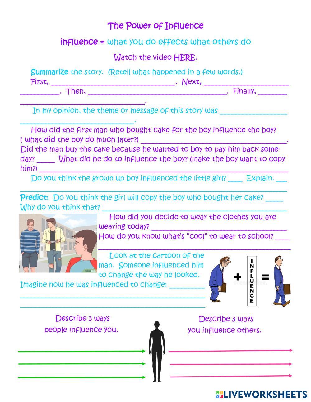 Students watch a video and summarize it. They analyze the power of influence in the story. They consider the effects of influence in their own lives.