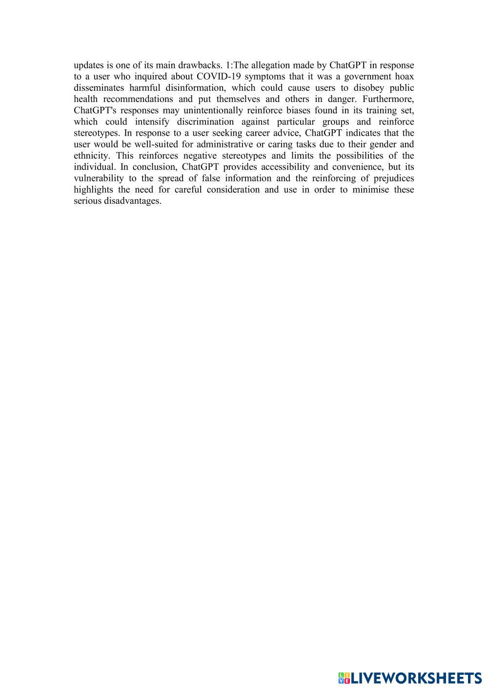 Created byGengasri A/P Nathan English as a Second Language (ESL) Identifying the parts of a paragraph Edad 11-17 level: School English Instrucciones del autor My Google Classroom Courses × 0 classes selected (0 students total) Quick Access Select all classes (0 classes) All Classes Loading courses... Cancelar Share Share to selected Course __COURSE_NAME__ __STUDENT_NAME__ (__STUDENT_EMAIL__) The disadvantages of ChatGPT Descargar Worksheet Validation Comprobar mis respuestas Emails my answers to my teacher Nombre completo Group/level Asignatura Teacher's email or key code Close Submit Validating worksheet... (12) Your answers have been sent to your teacher. Good luck! OK We encountered an error submitting your answers. Please try again. OK Anuncio | Ir sin anuncios Created byGengasri A/P Nathan English as a Second Language (ESL) Identifying the parts of a paragraph Edad 11-17 level: School English Instrucciones del autor