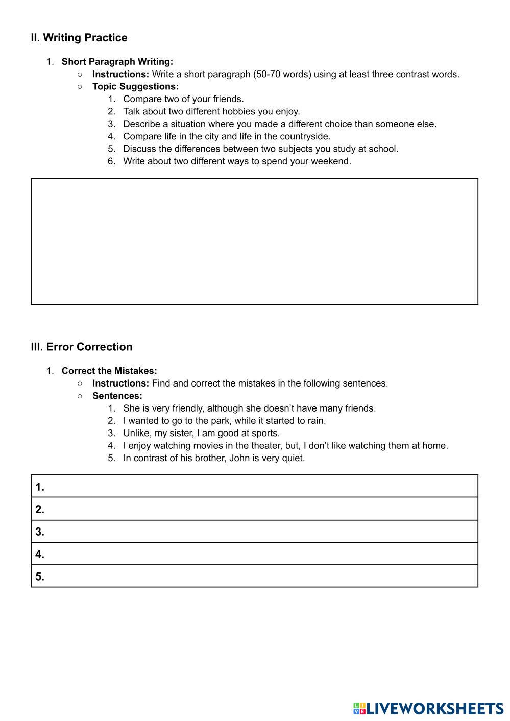 Created byAmelia English as a Second Language (ESL) Conjunctions Edad 12+ level: 5 English Author's Instructions My Google Classroom Courses × 0 classes selected (0 students total) Quick Access Select all classes (0 classes) All Classes Loading courses... Cancelar Share Share to selected Course __COURSE_NAME__ __STUDENT_NAME__ (__STUDENT_EMAIL__) Contrast Words: Usage and Examples Download Worksheet Validation Comprobar mis respuestas Emails my answers to my teacher Nombre completo Group/level Asignatura Teacher's email or key code Close Submit Validating worksheet... (12) Your answers have been sent to your teacher. Good luck! OK We encountered an error submitting your answers. Please try again. OK Anuncio | Ir sin anuncios Created byAmelia English as a Second Language (ESL) Conjunctions Edad 12+ level: 5 English Author's Instructions