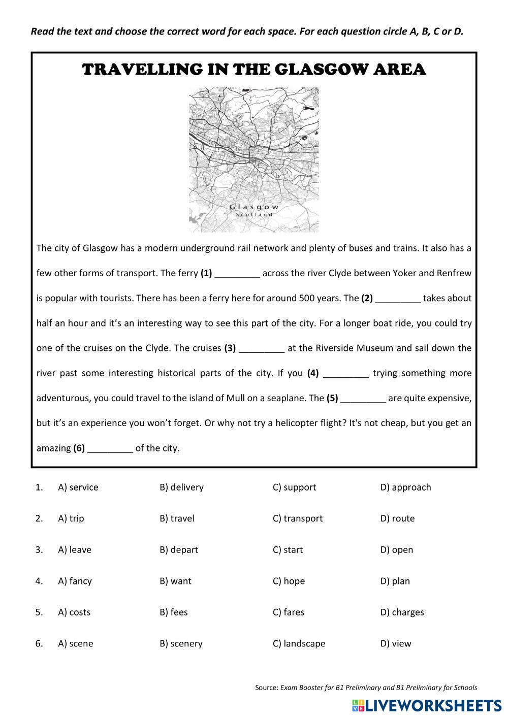 Created byThe Channel - Academia de idiomas English as a Second Language (ESL) Reading and use of English Edad 10+ level: B1 English Instrucciones del autor Read the text and choose the correct word for each space. For each question circle A, B, C or D. My Google Classroom Courses × 0 classes selected (0 students total) Quick Access Select all classes (0 classes) All Classes Loading courses... Cancelar Share Share to selected Course __COURSE_NAME__ __STUDENT_NAME__ (__STUDENT_EMAIL__) TRAVELLING IN THE GLASGOW AREA Descargar Worksheet Validation Comprobar mis respuestas Emails my answers to my teacher Nombre completo Group/level Asignatura Teacher's email or key code Close Submit Validating worksheet... (12) Your answers have been sent to your teacher. Good luck! OK We encountered an error submitting your answers. Please try again. OK Anuncio | Ir sin anuncios Created byThe Channel - Academia de idiomas English as a Second Language (ESL) Reading and use of English Edad 10+ level: B1 English Instrucciones del autor Read the text and choose the correct word for each space. For each question circle A, B, C or D.