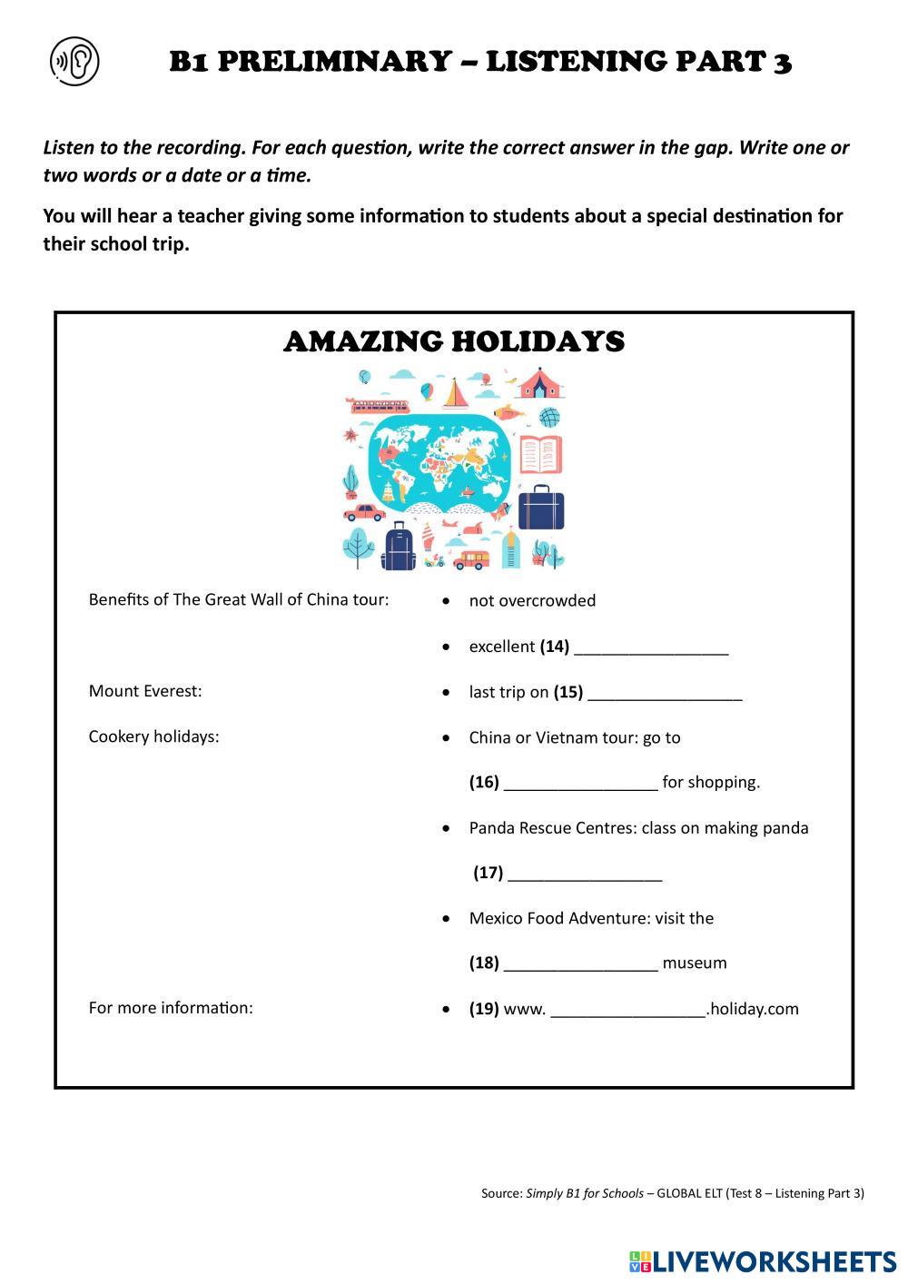 Listen to the recording. For each question, write the correct answer in the gap. Write one or two words or a date or a time.