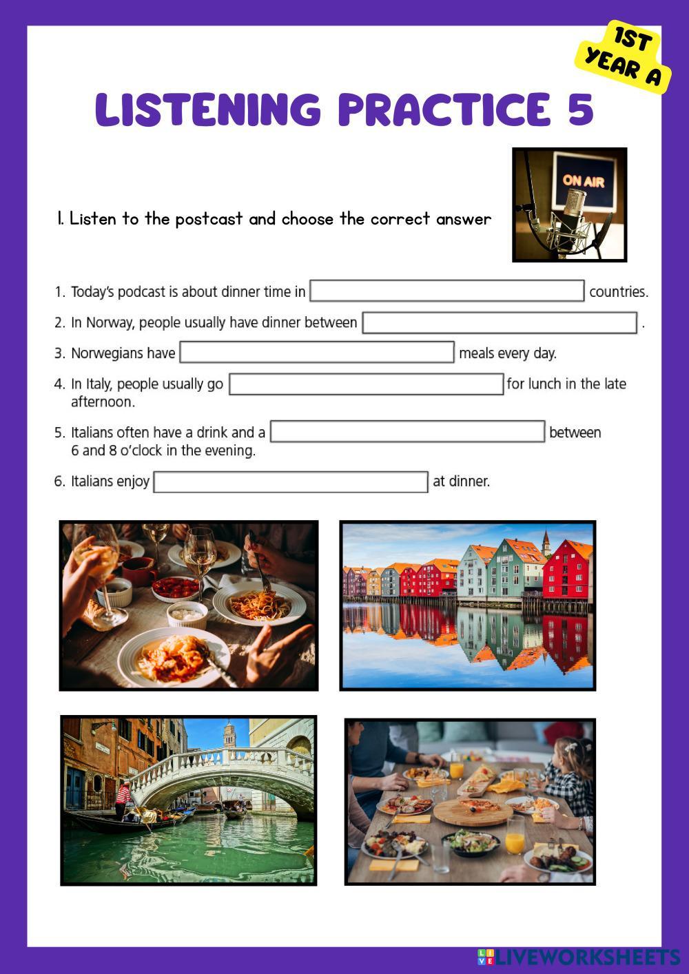 Created byAna María González English as a Second Language (ESL) Listening comprehension Edad 11+ level: 1st year English Instrucciones del autor My Google Classroom Courses × 0 classes selected (0 students total) Quick Access Select all classes (0 classes) All Classes Loading courses... Cancelar Share Share to selected Course __COURSE_NAME__ __STUDENT_NAME__ (__STUDENT_EMAIL__) 1st year A Listening practice 5 Descargar Worksheet Validation Comprobar mis respuestas Emails my answers to my teacher Nombre completo Group/level Asignatura Teacher's email or key code Close Submit Validating worksheet... (12) Your answers have been sent to your teacher. Good luck! OK We encountered an error submitting your answers. Please try again. OK Anuncio | Ir sin anuncios Created byAna María González English as a Second Language (ESL) Listening comprehension Edad 11+ level: 1st year English Instrucciones del autor
