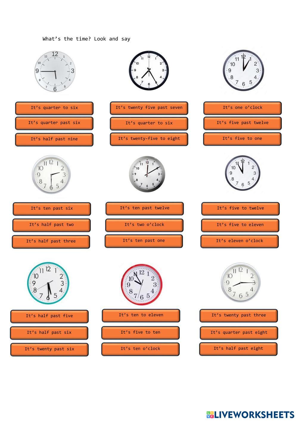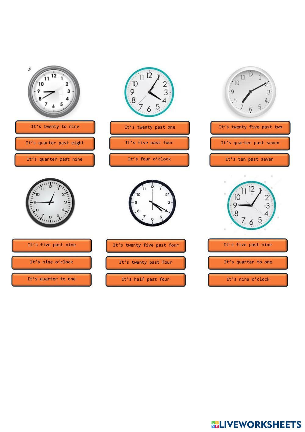 Created byJosé Javier Figueroa Criado English as a Second Language (ESL) Telling the time Edad 11-15 level: 6th grade English Instrucciones del autor My Google Classroom Courses × 0 classes selected (0 students total) Quick Access Select all classes (0 classes) All Classes Loading courses... Cancelar Share Share to selected Course __COURSE_NAME__ __STUDENT_NAME__ (__STUDENT_EMAIL__) What's the time? Descargar Worksheet Validation Comprobar mis respuestas Emails my answers to my teacher Nombre completo Group/level Asignatura Teacher's email or key code Close Submit Validating worksheet... (12) Your answers have been sent to your teacher. Good luck! OK We encountered an error submitting your answers. Please try again. OK Anuncio | Ir sin anuncios Created byJosé Javier Figueroa Criado English as a Second Language (ESL) Telling the time Edad 11-15 level: 6th grade English Instrucciones del autor