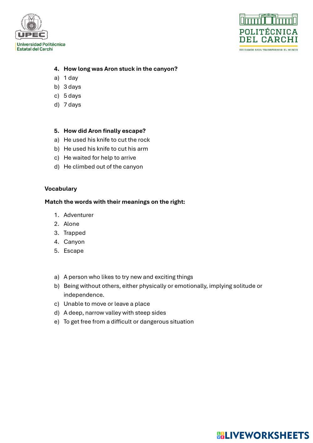 Created by vsorbe English as a Second Language (ESL) Reading comprehension Edad 17+ level: Elementary A2 English Instrucciones del autor My Google Classroom Courses × 0 classes selected (0 students total) Quick Access Select all classes (0 classes) All Classes Loading courses... Cancelar Share Share to selected Course __COURSE_NAME__ __STUDENT_NAME__ (__STUDENT_EMAIL__) A True Story About an Adventure Descargar Worksheet Validation Comprobar mis respuestas Emails my answers to my teacher Nombre completo Group/level Asignatura Teacher's email or key code Close Submit Validating worksheet... (12) Your answers have been sent to your teacher. Good luck! OK We encountered an error submitting your answers. Please try again. OK Anuncio | Ir sin anuncios Created by vsorbe English as a Second Language (ESL) Reading comprehension Edad 17+ level: Elementary A2 English Instrucciones del autor