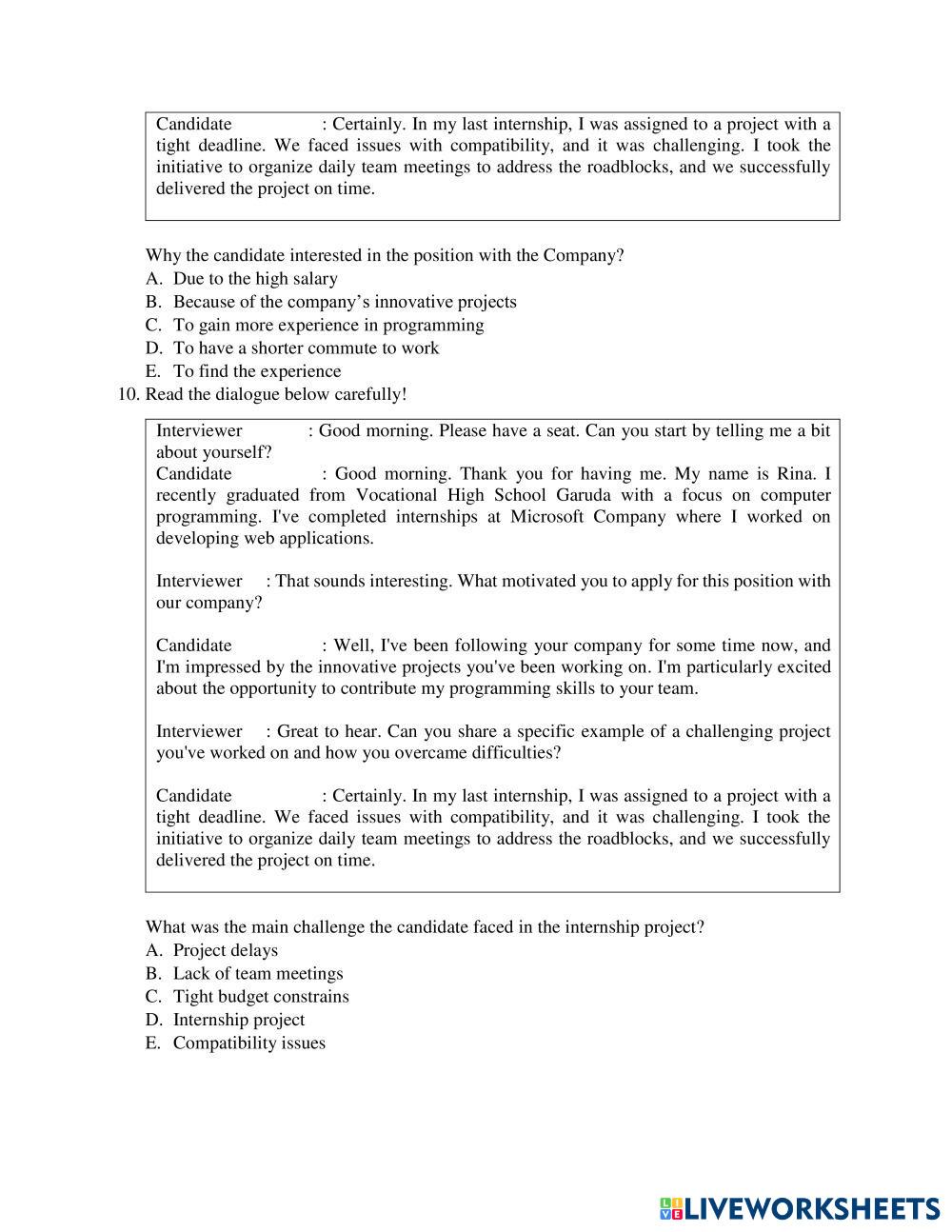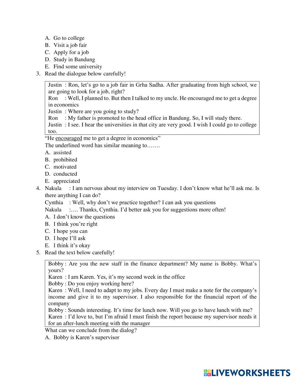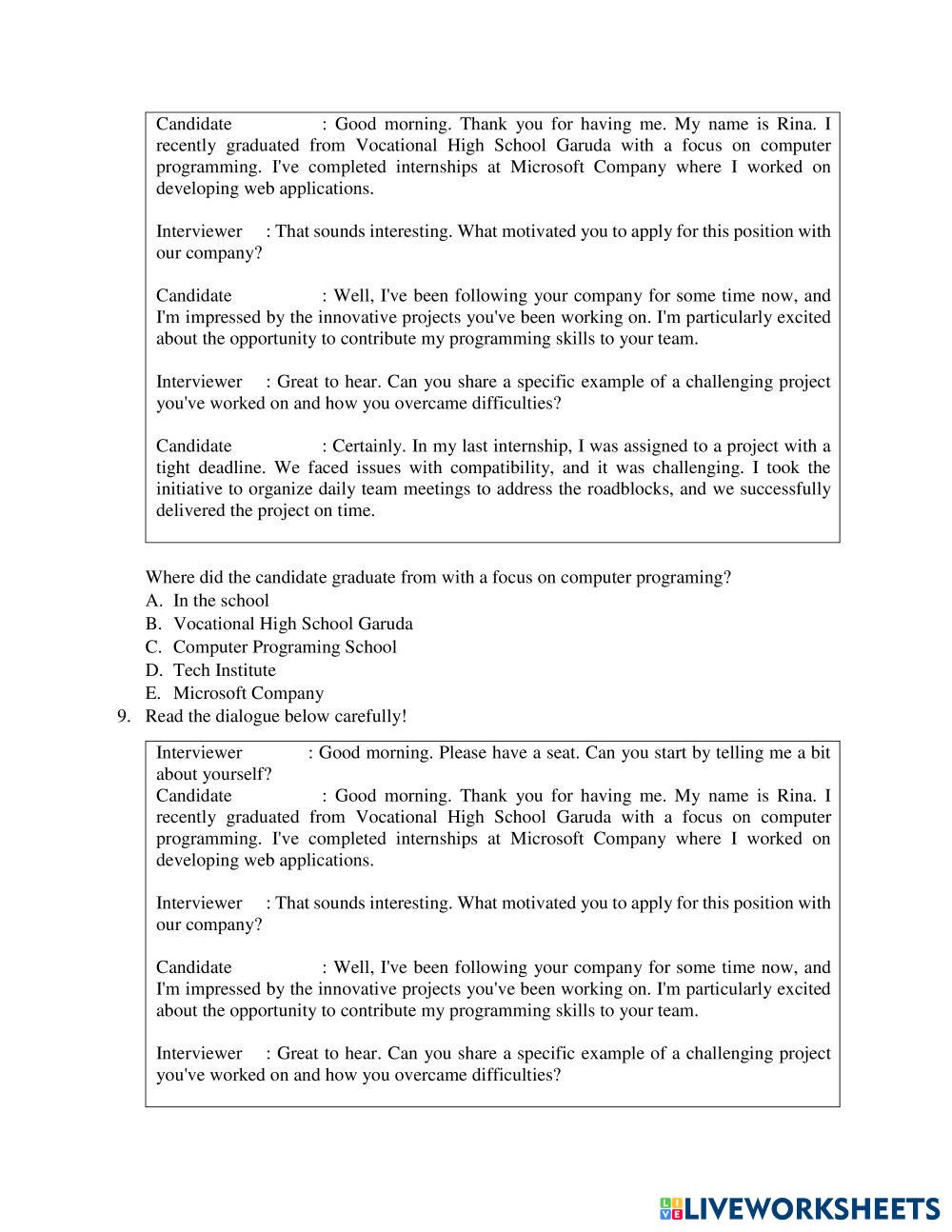 Created byLulu Faridah English for Senior High School Job Interview and Curriculum Vittae Edad 15+ level: Middle English Instrucciones del autor Kerjakan Soal dibawah ini dengan teliti dan benar My Google Classroom Courses × 0 classes selected (0 students total) Quick Access Select all classes (0 classes) All Classes Loading courses... Cancelar Share Share to selected Course __COURSE_NAME__ __STUDENT_NAME__ (__STUDENT_EMAIL__) SOAL PTS GENAP BAHASA INGGRIS Descargar Worksheet Validation Comprobar mis respuestas Emails my answers to my teacher Nombre completo Group/level Asignatura Teacher's email or key code Close Submit Validating worksheet... (12) Your answers have been sent to your teacher. Good luck! OK We encountered an error submitting your answers. Please try again. OK Anuncio | Ir sin anuncios Created byLulu Faridah English for Senior High School Job Interview and Curriculum Vittae Edad 15+ level: Middle English Instrucciones del autor Kerjakan Soal dibawah ini dengan teliti dan benar