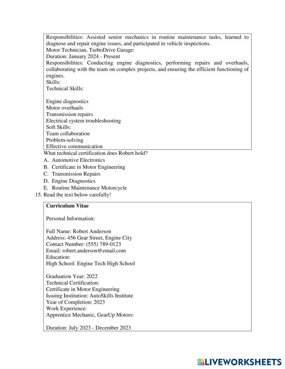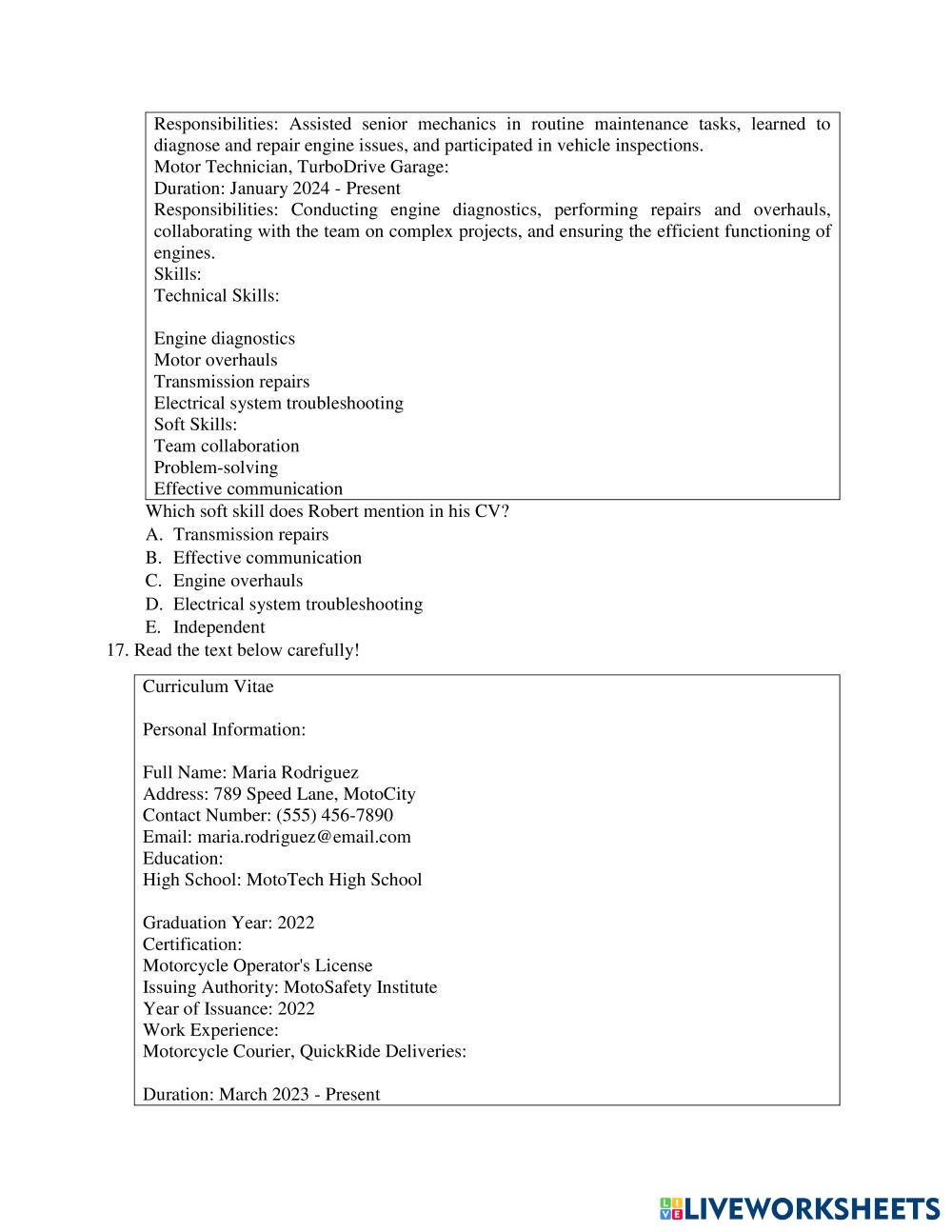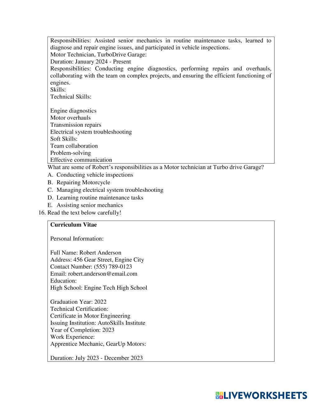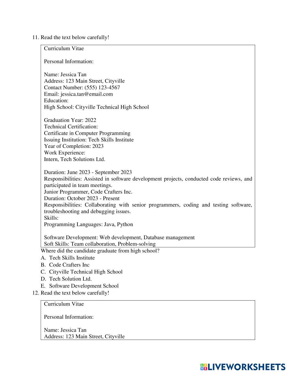 Created byLulu Faridah English for Senior High School Job Interview and Curriculum Vittae Edad 15+ level: Middle English Instrucciones del autor Kerjakan Soal dibawah ini dengan teliti dan benar My Google Classroom Courses × 0 classes selected (0 students total) Quick Access Select all classes (0 classes) All Classes Loading courses... Cancelar Share Share to selected Course __COURSE_NAME__ __STUDENT_NAME__ (__STUDENT_EMAIL__) SOAL PTS GENAP BAHASA INGGRIS Descargar Worksheet Validation Comprobar mis respuestas Emails my answers to my teacher Nombre completo Group/level Asignatura Teacher's email or key code Close Submit Validating worksheet... (12) Your answers have been sent to your teacher. Good luck! OK We encountered an error submitting your answers. Please try again. OK Anuncio | Ir sin anuncios Created byLulu Faridah English for Senior High School Job Interview and Curriculum Vittae Edad 15+ level: Middle English Instrucciones del autor Kerjakan Soal dibawah ini dengan teliti dan benar