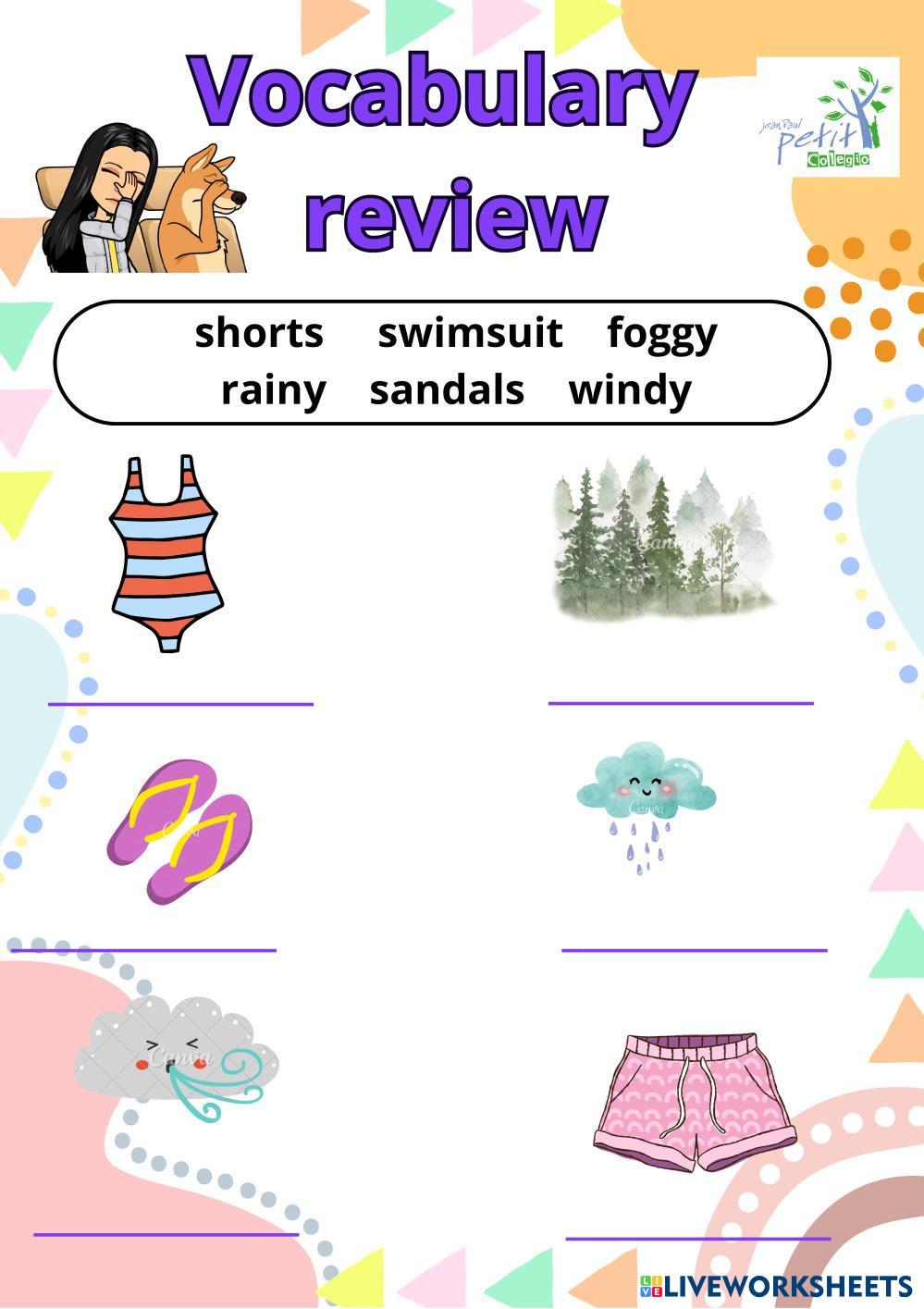 Created bybreida janitzy mendez otero ENGLISH ENGLISH Edad 10-15 level: 5 GRADE English Instrucciones del autor My Google Classroom Courses × 0 classes selected (0 students total) Quick Access Select all classes (0 classes) All Classes Loading courses... Cancelar Share Share to selected Course __COURSE_NAME__ __STUDENT_NAME__ (__STUDENT_EMAIL__) REVIEW OF VOCABULARY Descargar Worksheet Validation Comprobar mis respuestas Emails my answers to my teacher Nombre completo Group/level Asignatura Teacher's email or key code Close Submit Validating worksheet... (12) Your answers have been sent to your teacher. Good luck! OK We encountered an error submitting your answers. Please try again. OK Anuncio | Ir sin anuncios Created bybreida janitzy mendez otero ENGLISH ENGLISH Edad 10-15 level: 5 GRADE English Instrucciones del autor