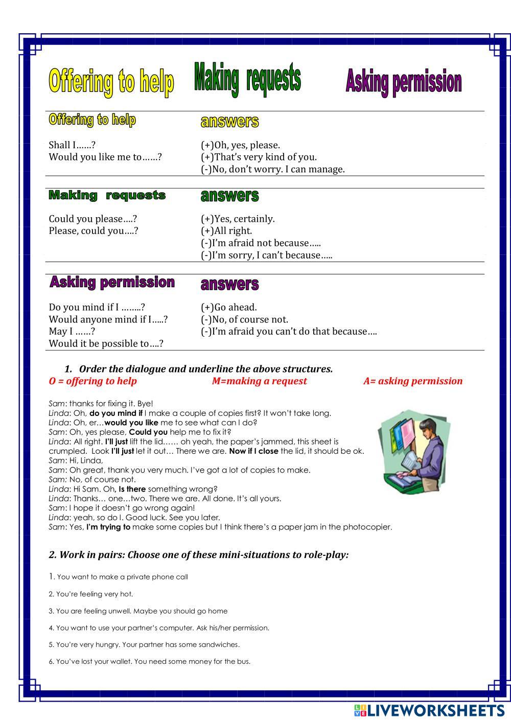 Created byHasaj Spela English requests, offers, permission Edad 14+ level: B1 English Instrucciones del autor My Google Classroom Courses × 0 classes selected (0 students total) Quick Access Select all classes (0 classes) All Classes Loading courses... Cancelar Share Share to selected Course __COURSE_NAME__ __STUDENT_NAME__ (__STUDENT_EMAIL__) Offering to help, Making requests, Asking permission Descargar Worksheet Validation Comprobar mis respuestas Emails my answers to my teacher Nombre completo Group/level Asignatura Teacher's email or key code Close Submit Validating worksheet... (12) Your answers have been sent to your teacher. Good luck! OK We encountered an error submitting your answers. Please try again. OK Anuncio | Ir sin anuncios Created byHasaj Spela English requests, offers, permission Edad 14+ level: B1 English Instrucciones del autor
