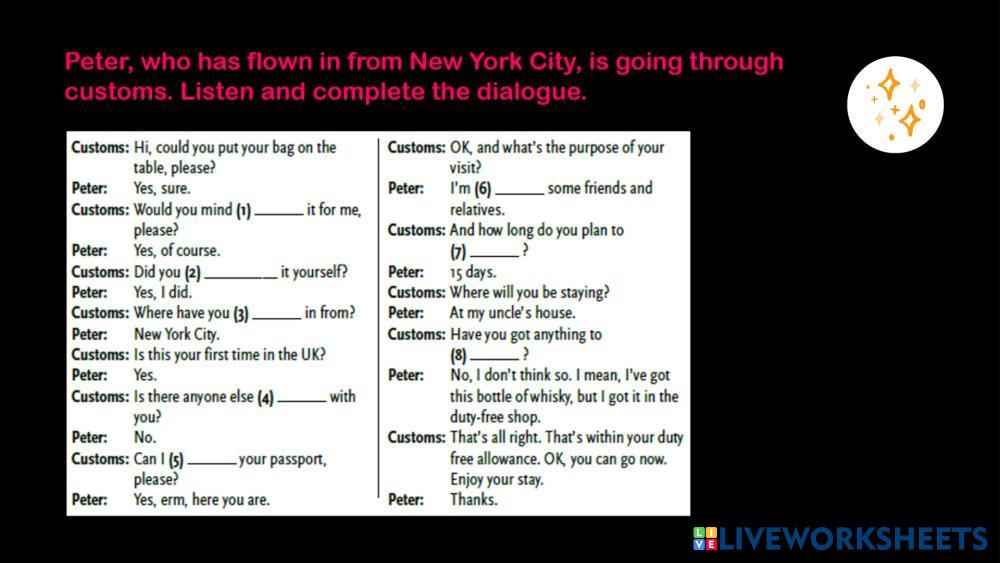 Created byNoelia Tartaglini English Listening Practice Edad 16+ level: B1 / B2 English Instrucciones del autor My Google Classroom Courses × 0 classes selected (0 students total) Quick Access Select all classes (0 classes) All Classes Loading courses... Cancelar Share Share to selected Course __COURSE_NAME__ __STUDENT_NAME__ (__STUDENT_EMAIL__) Going Through Customs Descargar Worksheet Validation Comprobar mis respuestas Emails my answers to my teacher Nombre completo Group/level Asignatura Teacher's email or key code Close Submit Validating worksheet... (12) Your answers have been sent to your teacher. Good luck! OK We encountered an error submitting your answers. Please try again. OK Anuncio | Ir sin anuncios Created byNoelia Tartaglini English Listening Practice Edad 16+ level: B1 / B2 English Instrucciones del autor
