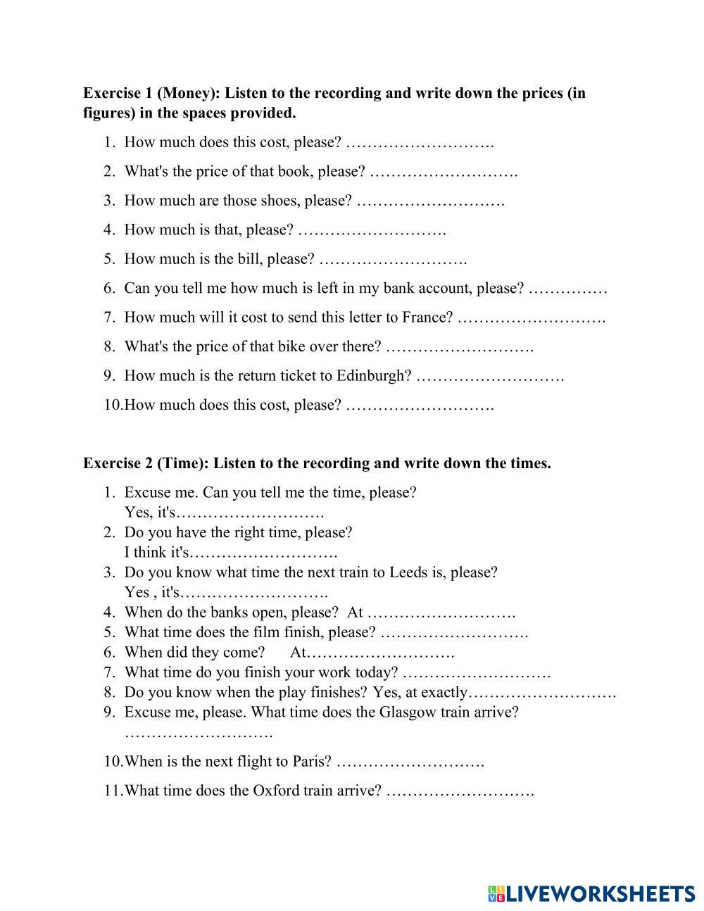 Created byCông ty TNHH Giáo dục XGEN English 5.0 Edad 12+ level: 5 English Author's Instructions My Google Classroom Courses × 0 classes selected (0 students total) Quick Access Select all classes (0 classes) All Classes Loading courses... Cancelar Share Share to selected Course __COURSE_NAME__ __STUDENT_NAME__ (__STUDENT_EMAIL__) Listening - Time, Money and Telephone Numbers Download Worksheet Validation Comprobar mis respuestas Emails my answers to my teacher Nombre completo Group/level Asignatura Teacher's email or key code Close Submit Validating worksheet... (12) Your answers have been sent to your teacher. Good luck! OK We encountered an error submitting your answers. Please try again. OK Anuncio | Ir sin anuncios Created byCông ty TNHH Giáo dục XGEN English 5.0 Edad 12+ level: 5 English Author's Instructions