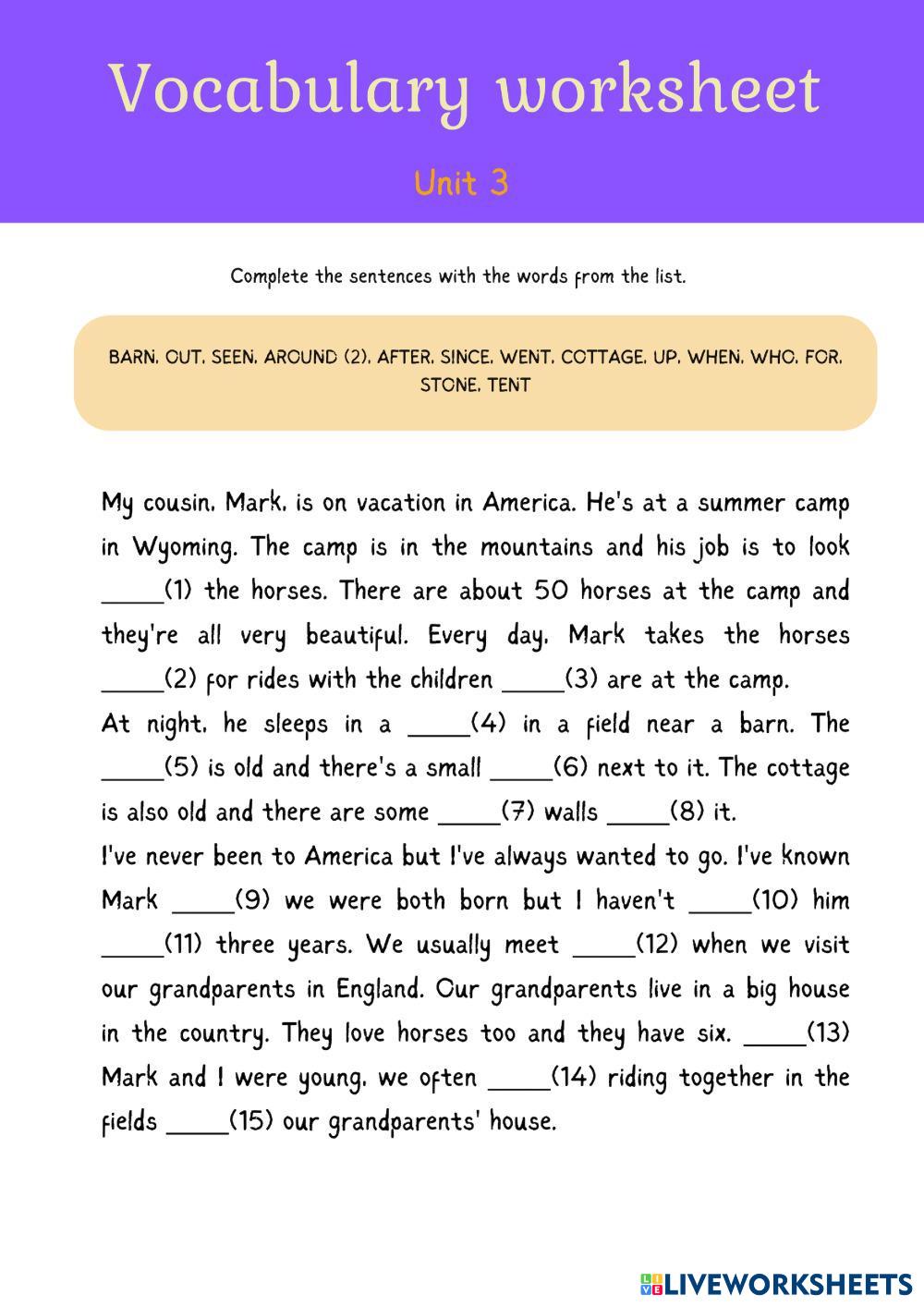 Created byTetiana Shcherbak English Vocabulary Review Edad 12-17 level: Grade 7 English Instrucciones del autor My Google Classroom Courses × 0 classes selected (0 students total) Quick Access Select all classes (0 classes) All Classes Loading courses... Cancelar Share Share to selected Course __COURSE_NAME__ __STUDENT_NAME__ (__STUDENT_EMAIL__) FB7 Module 3 Vocabulary Descargar Worksheet Validation Comprobar mis respuestas Emails my answers to my teacher Nombre completo Group/level Asignatura Teacher's email or key code Close Submit Validating worksheet... (12) Your answers have been sent to your teacher. Good luck! OK We encountered an error submitting your answers. Please try again. OK Anuncio | Ir sin anuncios Created byTetiana Shcherbak English Vocabulary Review Edad 12-17 level: Grade 7 English Instrucciones del autor