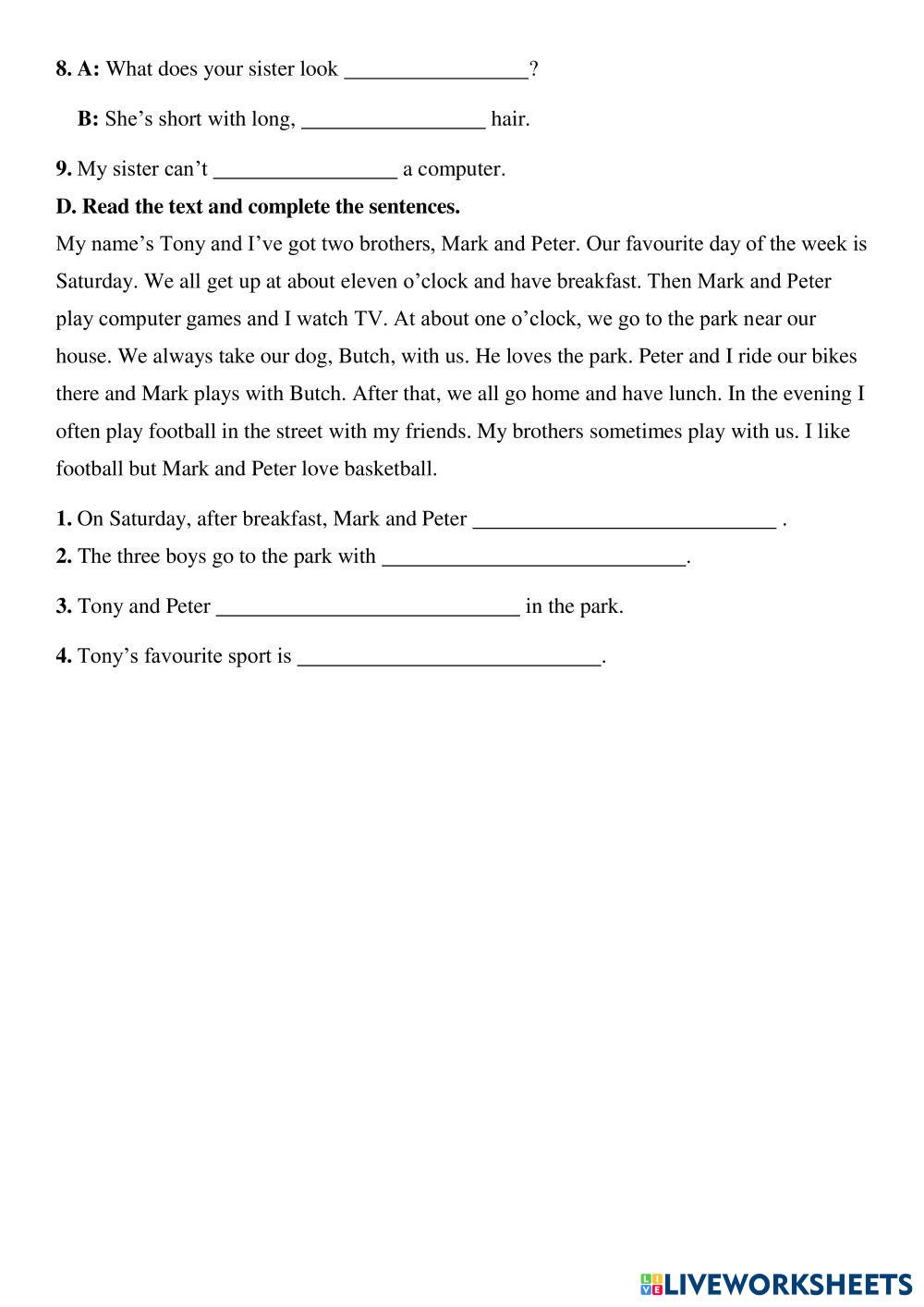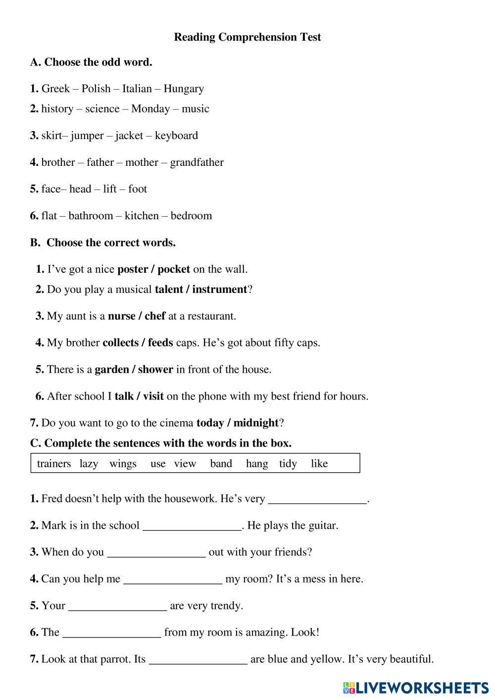Created byTetiana Shcherbak English Reading Test Edad 9-14 level: Grade 5 English Instrucciones del autor My Google Classroom Courses × 0 classes selected (0 students total) Quick Access Select all classes (0 classes) All Classes Loading courses... Cancelar Share Share to selected Course __COURSE_NAME__ __STUDENT_NAME__ (__STUDENT_EMAIL__) Full Blast 5 Reading Test Descargar Worksheet Validation Comprobar mis respuestas Emails my answers to my teacher Nombre completo Group/level Asignatura Teacher's email or key code Close Submit Validating worksheet... (12) Your answers have been sent to your teacher. Good luck! OK We encountered an error submitting your answers. Please try again. OK Anuncio | Ir sin anuncios Created byTetiana Shcherbak English Reading Test Edad 9-14 level: Grade 5 English Instrucciones del autor
