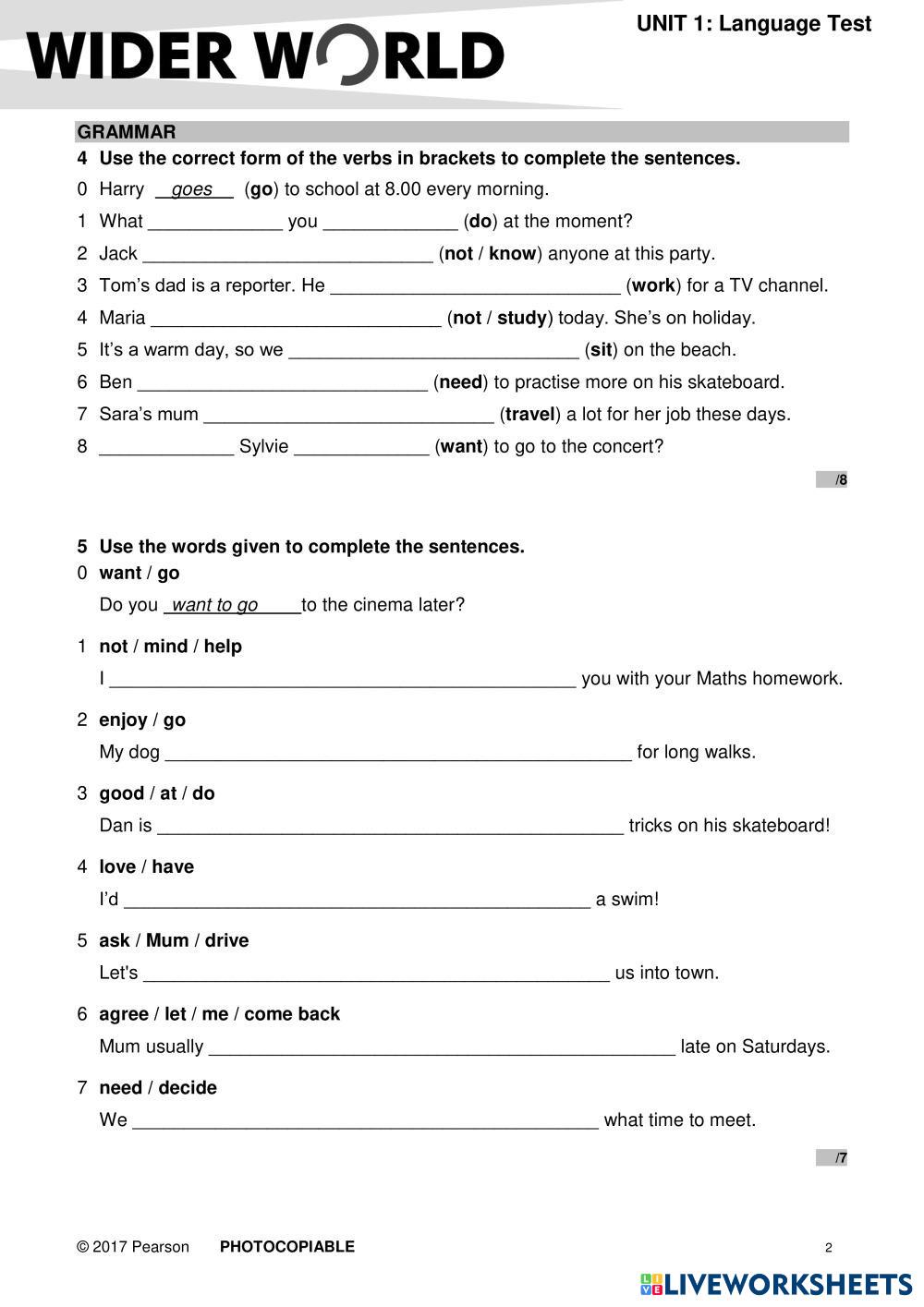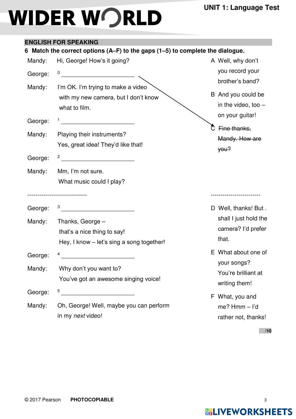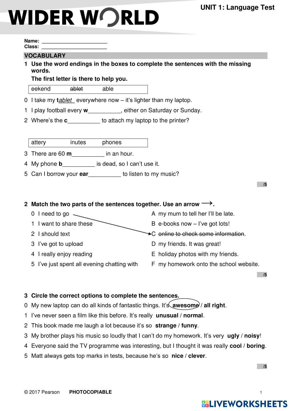 Created by Tatyana_Vladimirova English test Edad 9-16 level: B1 Ukrainian Author's Instructions My Google Classroom Courses × 0 classes selected (0 students total) Quick Access Select all classes (0 classes) All Classes Loading courses... Cancelar Share Share to selected Course __COURSE_NAME__ __STUDENT_NAME__ (__STUDENT_EMAIL__) Wider world 3 unit 1 Test1.1 Download Worksheet Validation Comprobar mis respuestas Emails my answers to my teacher Nombre completo Group/level Asignatura Teacher's email or key code Close Submit Validating worksheet... (12) Your answers have been sent to your teacher. Good luck! OK We encountered an error submitting your answers. Please try again. OK Anuncio | Ir sin anuncios Created by Tatyana_Vladimirova English test Edad 9-16 level: B1 Ukrainian Author's Instructions