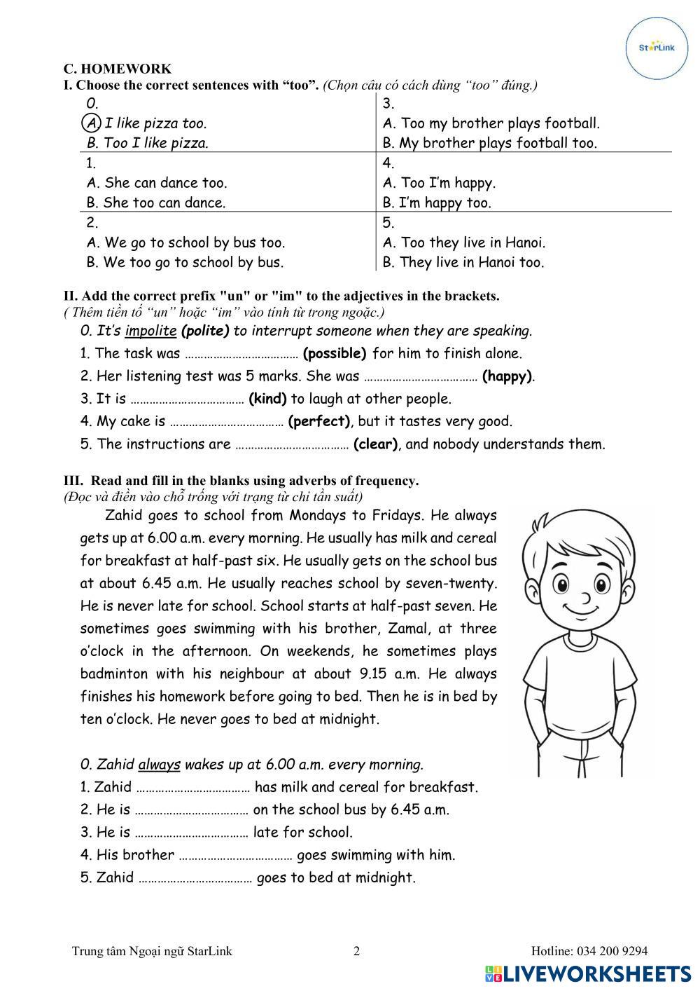 Created by starlink_s3 ESL English A2-Elementary Grammar English Author's Instructions StarLink My Google Classroom Courses × 0 classes selected (0 students total) Quick Access Select all classes (0 classes) All Classes Loading courses... Cancelar Share Share to selected Course __COURSE_NAME__ __STUDENT_NAME__ (__STUDENT_EMAIL__) Online_Viet Teacher_S3_W13_U4_Grammar Revision Download Worksheet Validation Comprobar mis respuestas Emails my answers to my teacher Nombre completo Group/level Asignatura Teacher's email or key code Close Submit Validating worksheet... (12) Your answers have been sent to your teacher. Good luck! OK We encountered an error submitting your answers. Please try again. OK Anuncio | Ir sin anuncios Created by starlink_s3 ESL English A2-Elementary Grammar English Author's Instructions StarLink Explore Worksheets Present Simple ESL A2-Elementary Present Simple Grammar - ESL English as a second language Present Simple exercices Present simple affirmative and negative ESL A2-Elementary Present simple affirmative and negative Grammar - ESL English as a second language This worksheet is not my product, I've just made it interactive. Main content: Present Simple Present Simple Tense ESL A2-Elementary Present Simple Tense Grammar - ESL English as a second language Two exercises to practise positive, negative and question form of present simple tense BASIC 2 MIDTERM EXAM ESL A2-Elementary BASIC 2 MIDTERM EXAM Grammar - ESL Contesta el examen. Al terminar, haz click en Finish y en Send answers to teacher. Escribe tu nombre completo y espera a que se valide el Worksheet. Después, puedes ver tu calificación en la esquina superior izquierda de tu examen.