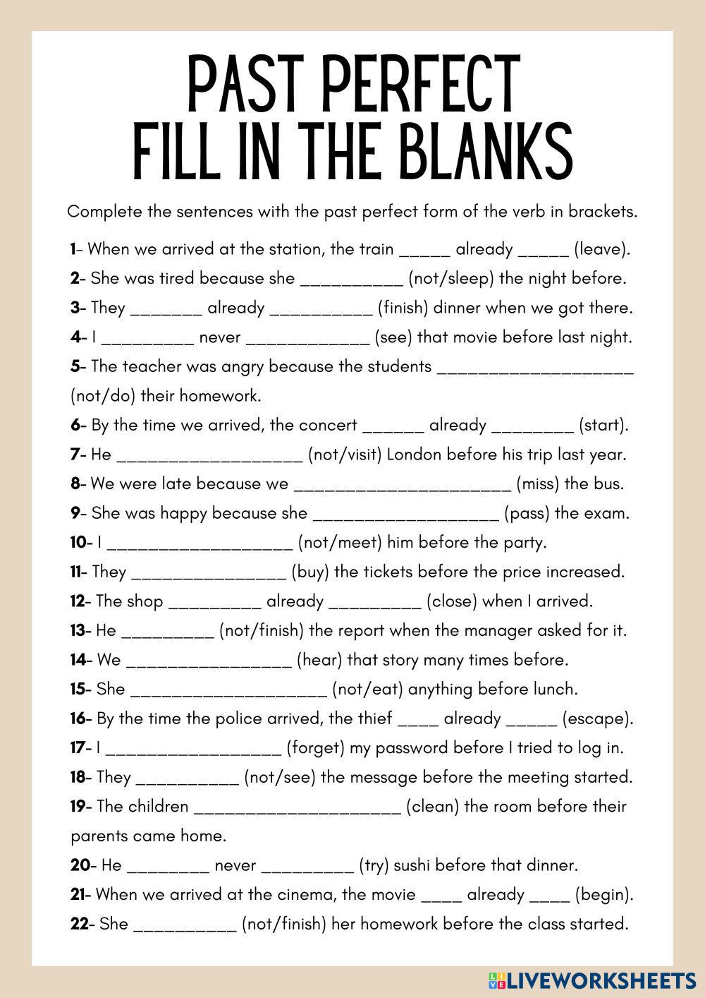 In this B1-level ESL worksheet, your students must fill in the blanks with the appropriate form of the verb in the Past Perfect tense.