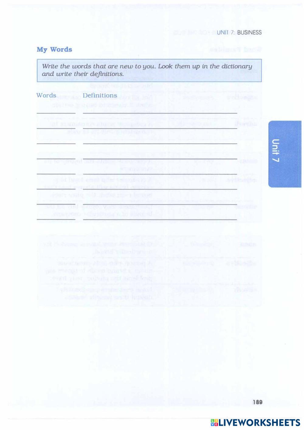 Created byZon Vu ESL English B1 (Intermedio Bajo) Gramática English Instrucciones del autor U7 -Brand Loyalty- Barron Essential Words My Google Classroom Courses × 0 classes selected (0 students total) Quick Access Select all classes (0 classes) All Classes Loading courses... Cancelar Share Share to selected Course __COURSE_NAME__ __STUDENT_NAME__ (__STUDENT_EMAIL__) U7 -Brand Loyalty- Barron Essential Words Descargar Worksheet Validation Comprobar mis respuestas Emails my answers to my teacher Nombre completo Group/level Asignatura Teacher's email or key code Close Submit Validating worksheet... (12) Your answers have been sent to your teacher. Good luck! OK We encountered an error submitting your answers. Please try again. OK Anuncio | Ir sin anuncios Created byZon Vu ESL English B1 (Intermedio Bajo) Gramática English Instrucciones del autor U7 -Brand Loyalty- Barron Essential Words Explora las hojas de trabajo FUTURE TENSE WILL-GOING TO BY EFC ESL B1 FUTURE TENSE WILL-GOING TO BY EFC Grammar - ESL READ AND FOLLOW THE INSTRUCTIONS. U8 -Wheelchair-Accessibillty Issues- Barron Essential Words ESL B1 U8 -Wheelchair-Accessibillty Issues- Barron Essential Words Grammar - ESL U8 -Wheelchair-Accessibillty Issues- Barron Essential Words U8 -Why Are Women Leaving Science Careers?- Barron Essential Words ESL B1 U8 -Why Are Women Leaving Science Careers?- Barron Essential Words Grammar - ESL U8 -Why Are Women Leaving Science Careers?- Barron Essential Words U8 -Social Networking- Barron Essential Words ESL B1 U8 -Social Networking- Barron Essential Words Grammar - ESL U8 -Social Networking- Barron Essential Words