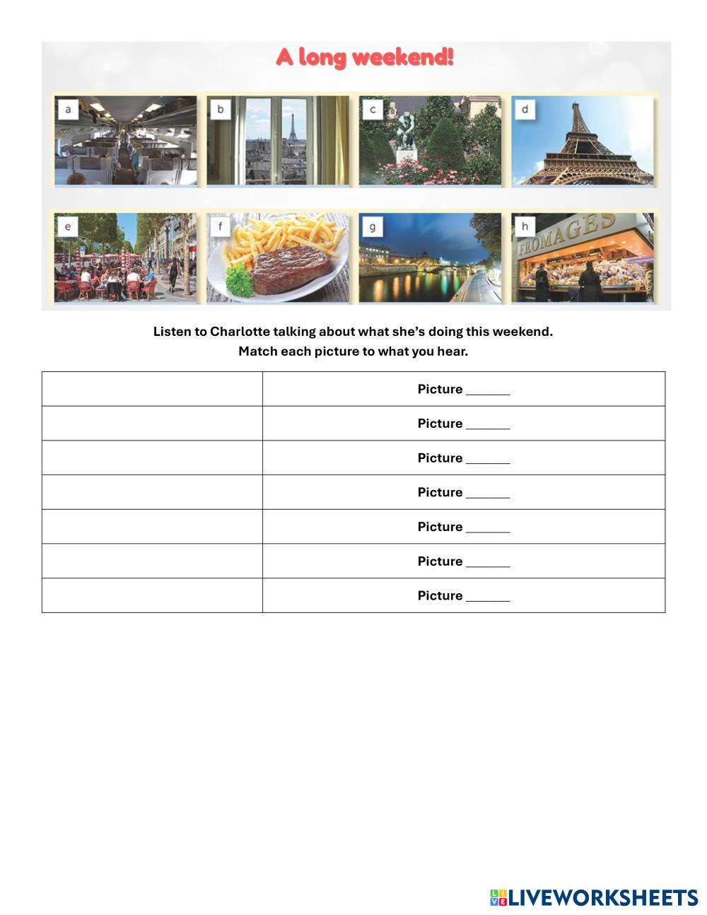 Listen to Charlotte talk about her weekend. Match what you hear to the corresponding picture.