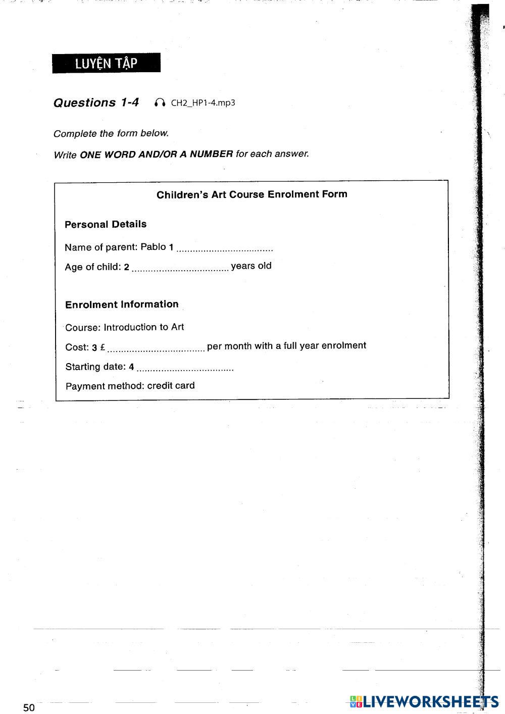 Created byZon Vu ESL English B2 (Intermedio Alto) Escucha English Instrucciones del autor Hackers IELTS Listening - Chap 2 - page 3 My Google Classroom Courses × 0 classes selected (0 students total) Quick Access Select all classes (0 classes) All Classes Loading courses... Cancelar Share Share to selected Course __COURSE_NAME__ __STUDENT_NAME__ (__STUDENT_EMAIL__) Hackers IELTS Listening - Chap 2 - page 3 Descargar Worksheet Validation Comprobar mis respuestas Emails my answers to my teacher Nombre completo Group/level Asignatura Teacher's email or key code Close Submit Validating worksheet... (12) Your answers have been sent to your teacher. Good luck! OK We encountered an error submitting your answers. Please try again. OK Anuncio | Ir sin anuncios Created byZon Vu ESL English B2 (Intermedio Alto) Escucha English Instrucciones del autor Hackers IELTS Listening - Chap 2 - page 3 Explora las hojas de trabajo British English: Listening Comprehension 6 ESL B2 British English: Listening Comprehension 6 Listening - ESL Students watch a video and answer some questions. [Test] CAM 19 - TEST 4 - PART 3 BOOK PRESERVATION AND TREASURED MEMORIES ESL B2 [Test] CAM 19 - TEST 4 - PART 3 BOOK PRESERVATION AND TREASURED MEMORIES Listening - ESL Section 3 - Questions 21–25 Choose the correct letter, A, B or C. [Dictation] CAM 19 - TEST 4 - PART 3: BOOK PRESERVATION AND TREASURED MEMORIES ESL B2 [Dictation] CAM 19 - TEST 4 - PART 3: BOOK PRESERVATION AND TREASURED MEMORIES Listening - ESL CAM 19 - TEST 4 - PART 3 BOOK PRESERVATION AND TREASURED MEMORIES Hackers IELTS Listening - Chap 2 - page 9&10 ESL B2 Hackers IELTS Listening - Chap 2 - page 9&10 Listening - ESL Hackers IELTS Listening - Chap 2 - page 9&10