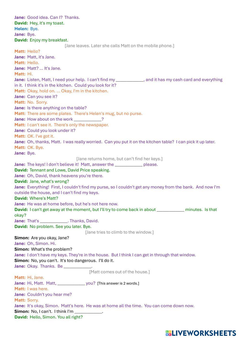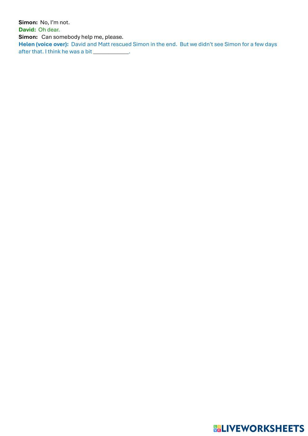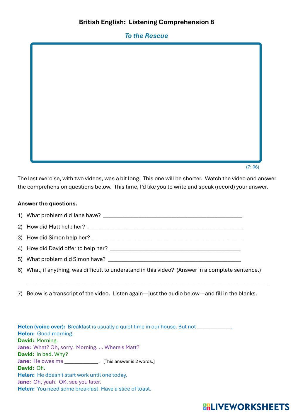 Created by Cadmus ESL B2 (Intermedio Alto) Escucha English Instrucciones del autor Students watch a video and answer comprehension questions. My Google Classroom Courses × 0 classes selected (0 students total) Quick Access Select all classes (0 classes) All Classes Loading courses... Cancelar Share Share to selected Course __COURSE_NAME__ __STUDENT_NAME__ (__STUDENT_EMAIL__) British English: Listening Comprehension 8 Descargar Worksheet Validation Comprobar mis respuestas Emails my answers to my teacher Nombre completo Group/level Asignatura Teacher's email or key code Close Submit Validating worksheet... (12) Your answers have been sent to your teacher. Good luck! OK We encountered an error submitting your answers. Please try again. OK Anuncio | Ir sin anuncios Created by Cadmus ESL B2 (Intermedio Alto) Escucha English Instrucciones del autor Students watch a video and answer comprehension questions. Explora las hojas de trabajo B2 Listening Test (How to improve your memory) ESL B2 B2 Listening Test (How to improve your memory) Listening - ESL Listen and complete exercises British English: Listening Comprehension 9 ESL B2 British English: Listening Comprehension 9 Listening - ESL Students watch the video and answer the questions. How do animals do that: Whale songs and cool canines ESL B2 How do animals do that: Whale songs and cool canines Listening - ESL Listen and answer. [Dictation]CAM 20 - TEST 1 - PART 1 Restaurant Recommendations ESL B2 [Dictation]CAM 20 - TEST 1 - PART 1 Restaurant Recommendations Listening - ESL Write ONE WORD ONLY for each answer.
