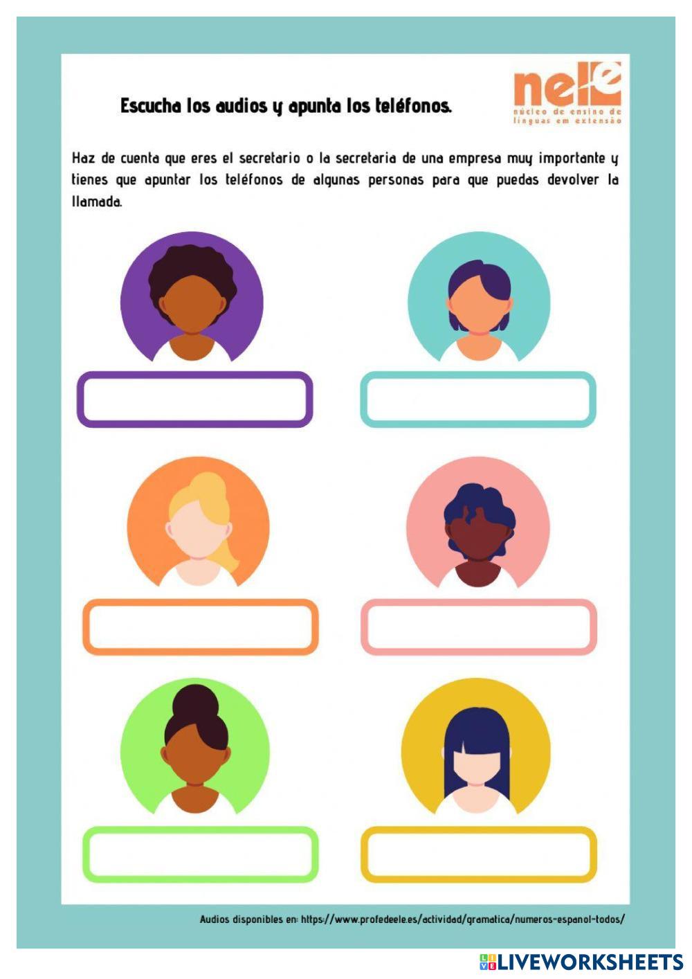 Created by senorcano ESL Spanish A2 (Básico) Escucha English Instrucciones del autor Escucha y escribe el número de teléfono. My Google Classroom Courses × 0 classes selected (0 students total) Quick Access Select all classes (0 classes) All Classes Loading courses... Cancelar Share Share to selected Course __COURSE_NAME__ __STUDENT_NAME__ (__STUDENT_EMAIL__) Número de teléfono Descargar Worksheet Validation Comprobar mis respuestas Emails my answers to my teacher Nombre completo Group/level Asignatura Teacher's email or key code Close Submit Validating worksheet... (12) Your answers have been sent to your teacher. Good luck! OK We encountered an error submitting your answers. Please try again. OK Anuncio | Ir sin anuncios Created by senorcano ESL Spanish A2 (Básico) Escucha English Instrucciones del autor Escucha y escribe el número de teléfono. Explora las hojas de trabajo La casa ESL A2 La casa Listening - ESL Sigue instrucciones Review of Verb Forms -- Listening ESL A2 Review of Verb Forms -- Listening Listening - ESL Do the activities Activity: CAN ESL A2 Activity: CAN Listening - ESL Activity: CAN 📌 Instructions Write the sentences using CAN. Use complete sentences. Acentuando palabras ESL A2 Acentuando palabras Listening - ESL Tiene que clasificar las palabras según su acentuación
