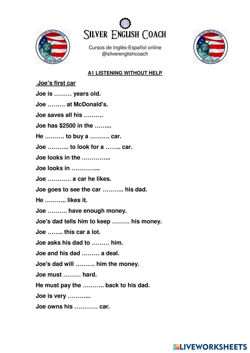 Created bySilver English Coach ESL English A1 (Principiante) Escucha English Instrucciones del autor COMPLETE THIS TEXT WITHOUT HELPING WORDS My Google Classroom Courses × 0 classes selected (0 students total) Quick Access Select all classes (0 classes) All Classes Loading courses... Cancelar Share Share to selected Course __COURSE_NAME__ __STUDENT_NAME__ (__STUDENT_EMAIL__) A1 JOE'S FIRST CAR Descargar Worksheet Validation Comprobar mis respuestas Emails my answers to my teacher Nombre completo Group/level Asignatura Teacher's email or key code Close Submit Validating worksheet... (12) Your answers have been sent to your teacher. Good luck! OK We encountered an error submitting your answers. Please try again. OK Anuncio | Ir sin anuncios Created bySilver English Coach ESL English A1 (Principiante) Escucha English Instrucciones del autor COMPLETE THIS TEXT WITHOUT HELPING WORDS Explora las hojas de trabajo A1 JOE'S FIRST CAR 2 ESL A1 A1 JOE'S FIRST CAR 2 Listening - ESL COMPLETE THE FOLLOWING LISTENING WITH HELP Verb to be ESL A1 Verb to be Listening - ESL A worksheet to practise the verb to BE in the present simple tense. This worksheet is copyrighted by Alenka, published with permission. Thanks a lot!! Fracciones - unir con flechas ESL A1 Fracciones - unir con flechas Listening - ESL Ejercicio de unir con flechas para practicar las fracciones, su representación y su lectura. Para niños y niñas de 3º o 4º de primaria. Test tháng 3 - Movers ESL A1 Test tháng 3 - Movers Listening - ESL Trung tâm Ngoại ngữ Shining Học kì II - Năm học 2025-2026 Lớp: Movers